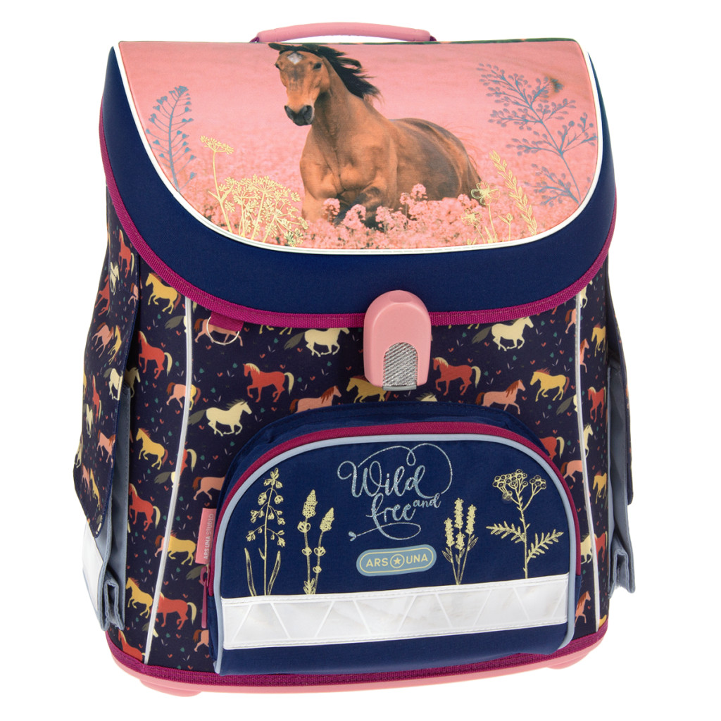 Hátizsák formájú iskolatáska. Könnyű súlyú, formatartó szerkezetű, vízlepergető anyagból. Gerinckímélő, vastagon párnázott, merevített, ergonómikus hátkiképzéssel. Puha, méretre állítható vállpántokkal és plusz állítható pántokkal, amelyekekkel szabályozható, hogy mennyire álljon feszesen a gyerek hátához simulva a táska. Alja tartós kemény műanyag. Nagy felületű fényvisszaverő elemekkel elől, oldalt és a vállpántokon. Felülről könnyen pakolható, teteje FIDLOCK mágneszárral záródik. Belsejében egy textil elválasztó elemmel, két nagy rekesszel. A táska tetején belül átlátszó műanyag órarendtartóval és órarenddel. Oldalán két zsebbel a kulacs részére, elején egy cipzáros zseb az uzsonnás doboz részére. Tetején műanyag fogantyúval. Mérete: 330x410x255 mm. Súlya: 1.2 kg. Táska űrtartalma: 18 l. Terhelhetőség: 12 kg. 3 év garancia.