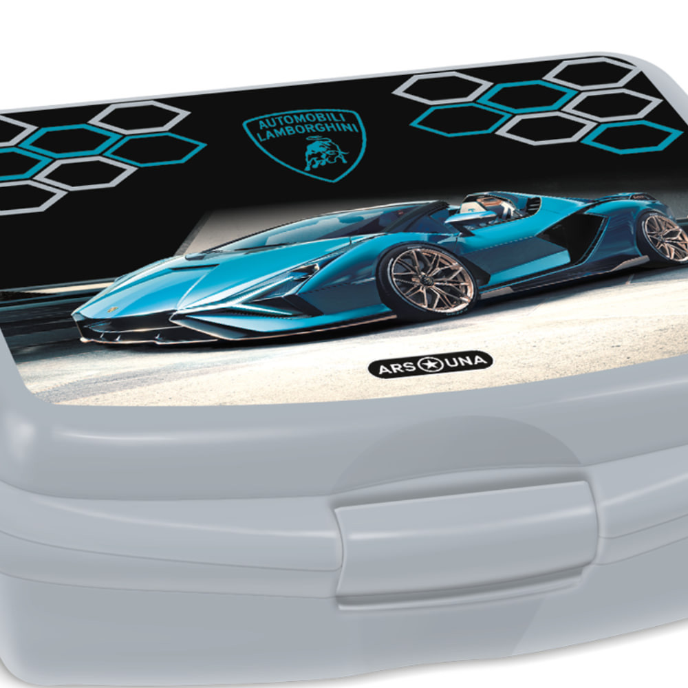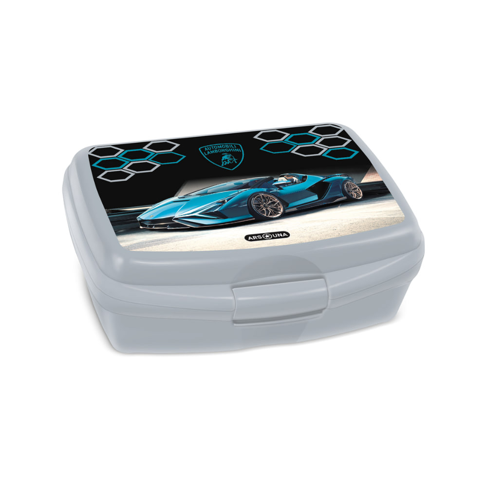 Vagány és praktikus uzsonnás doboz szürke alapon, kék Lamborghini sportautó mintával – ideális választás a mindennapi tízóraik és uzsonnák tárolására.