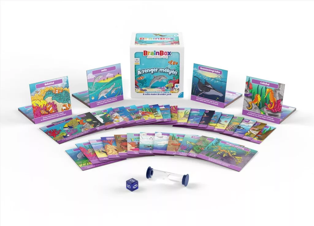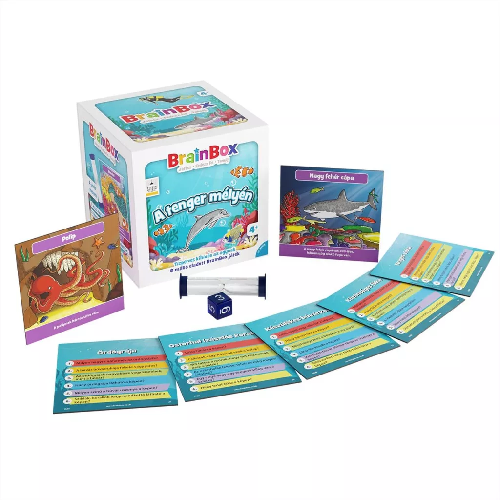 A BrainBox A tenger mélyén izgalmas kihívás az agynak! Gyorsan tanulsz? Lássuk, hogy boldogulsz az a víz alatt élő állatokkal! A BrainBox A tenger világa remek agytorna és szórakozás, egy vagy akár több játékos részére! Húzz egy kártyát, tanulmányozd, és jegyezz meg minél több információt 10 másodperc alatt. Ezután fordítsd le a kártyát, dobj a kockával, és válaszolj helyesen a kidobott számmal jelölt kérdésre. Ne húzd ám az időt, hiszen a homokórán gyorsan leperegnek a szemek! A válaszokat a kártyán ellenőrizheted. Ha jó megfigyelő vagy, és jól ismered a vízben lubickoló állatkákat, akkor a legtöbb kártya nálad landol! A BrainBox a gyors megfigyelések és a vizuálismemória-kérdések családi játéka.