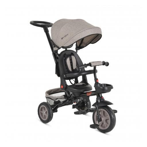 Kerekek - gumi, nem felfújható. Első kerék állítható szabadonfutó funkcióra. Levehető biztonsági karfa, 3 pontos biztonsági övek. Két hátsó fék. Első és hátsó játékkosár. Táska a tartozékok számára.