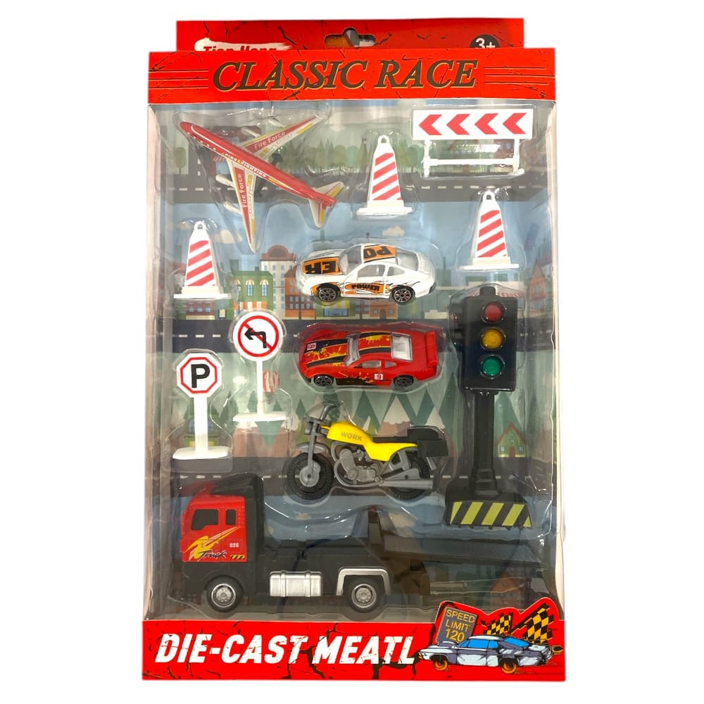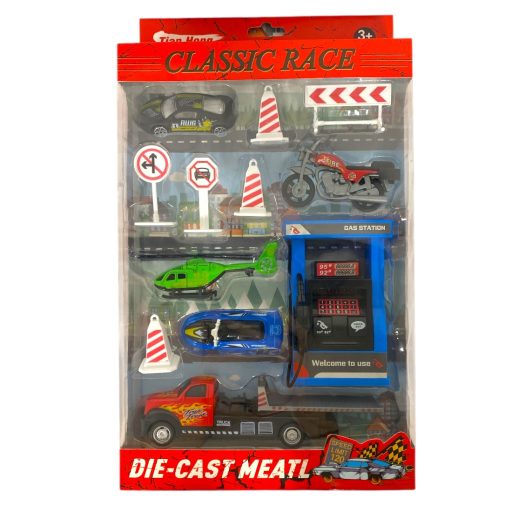 Fém autószállító klt., autó + motor, kieg., 2 féle, 12x36 cm dob.