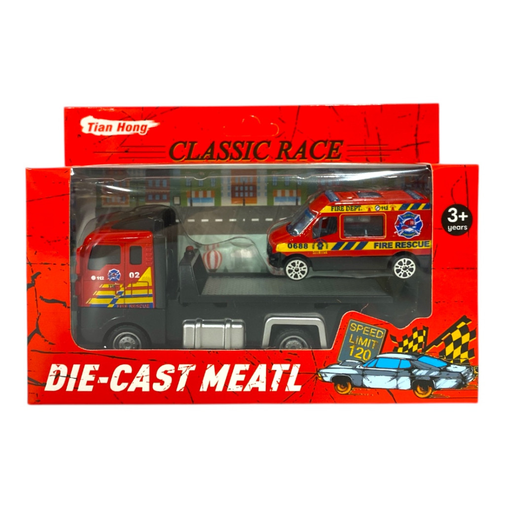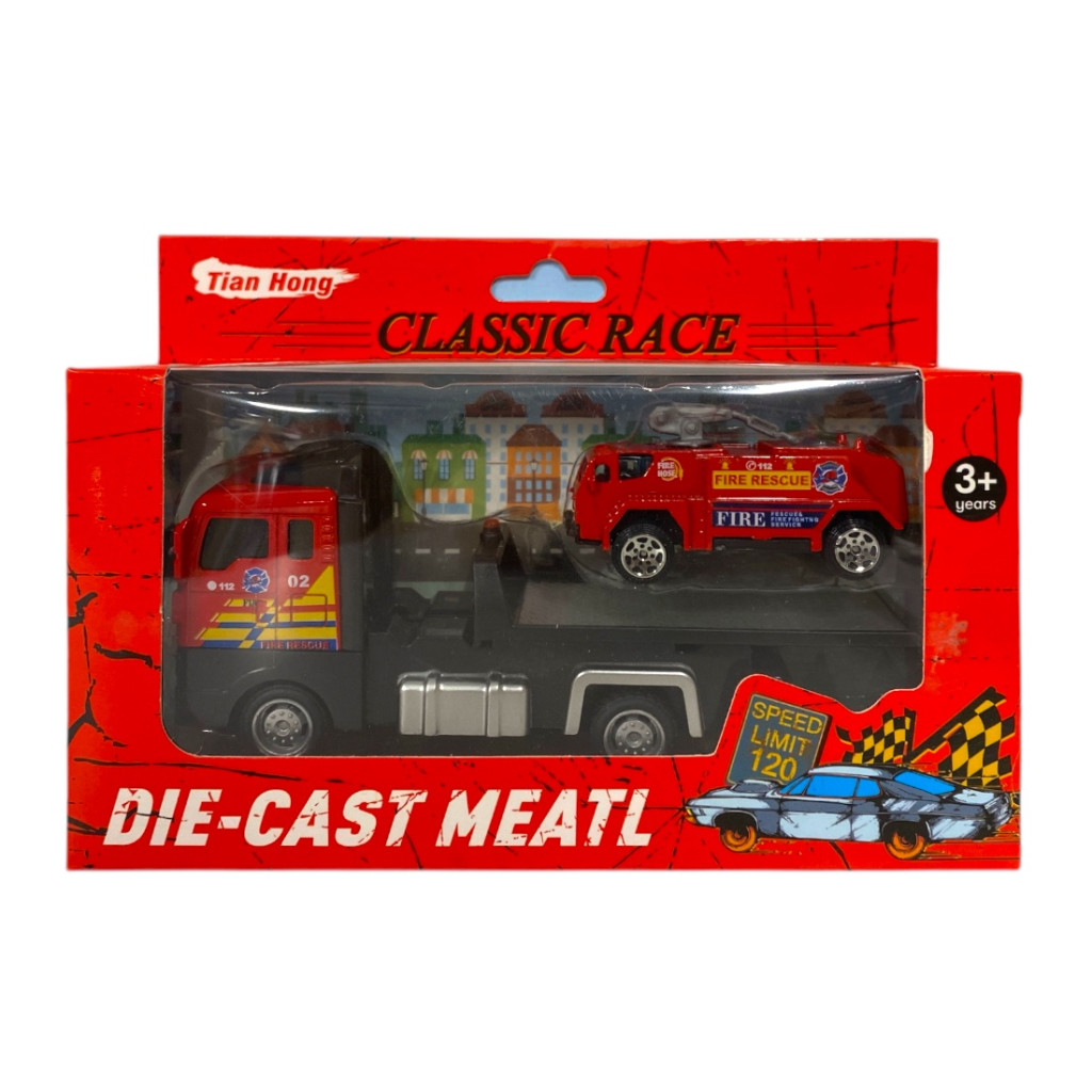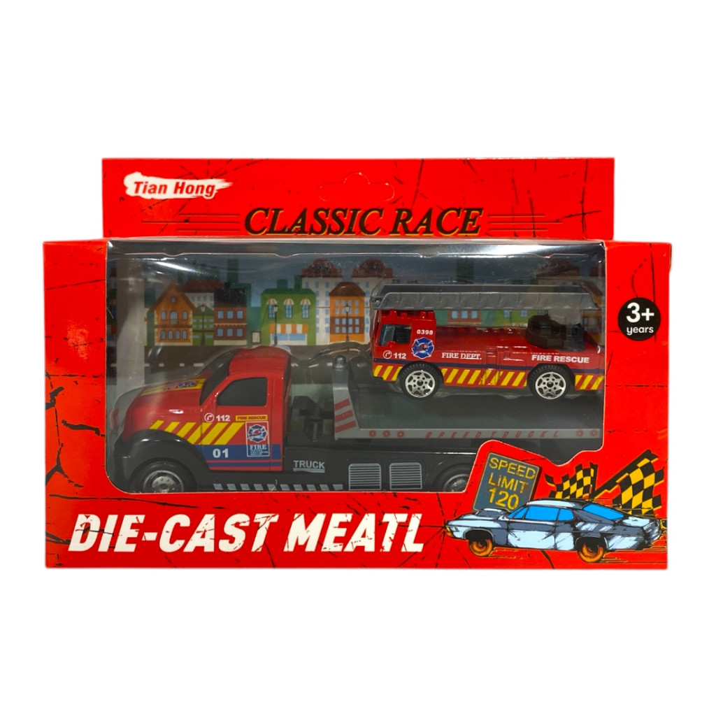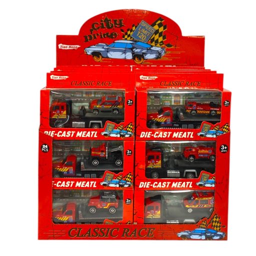 Fém autószállító klt., tűzoltósági, +autó, 19x10 cm dob. 24 db/disp.