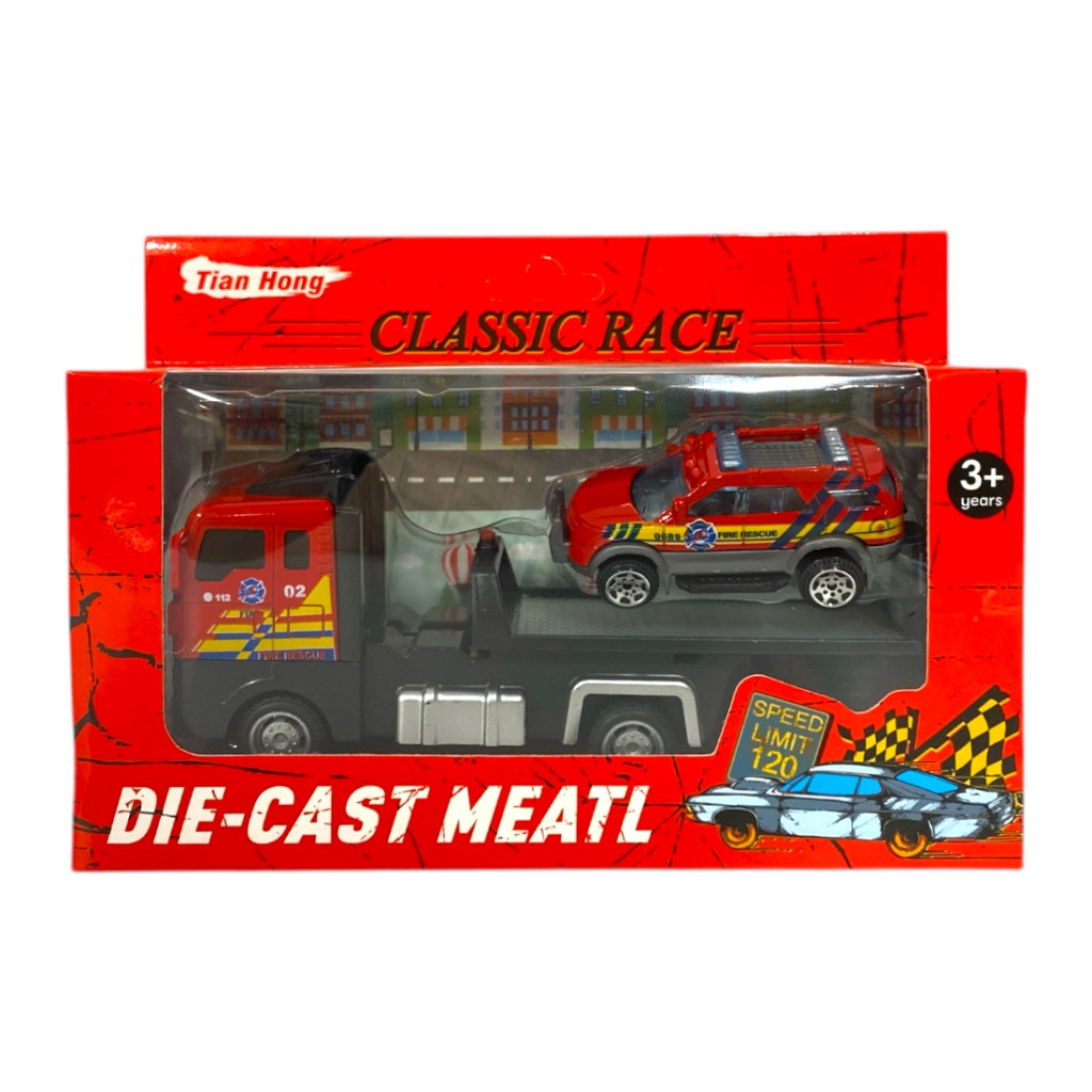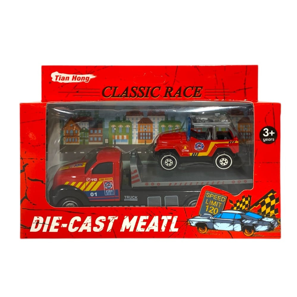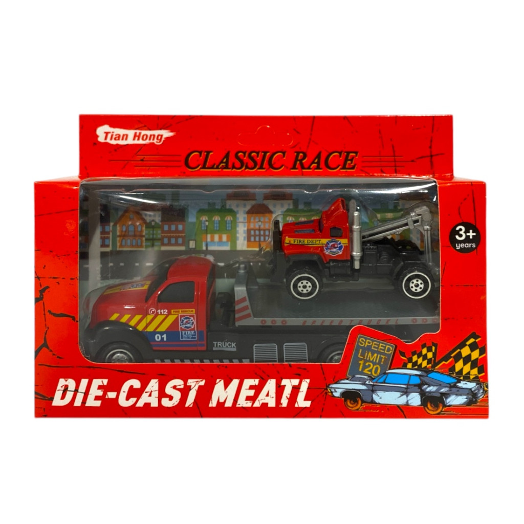 Fém autószállító klt., tűzoltósági, +autó, 19x10 cm dob. 24 db/disp.