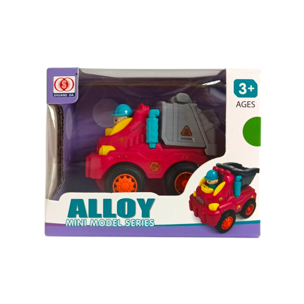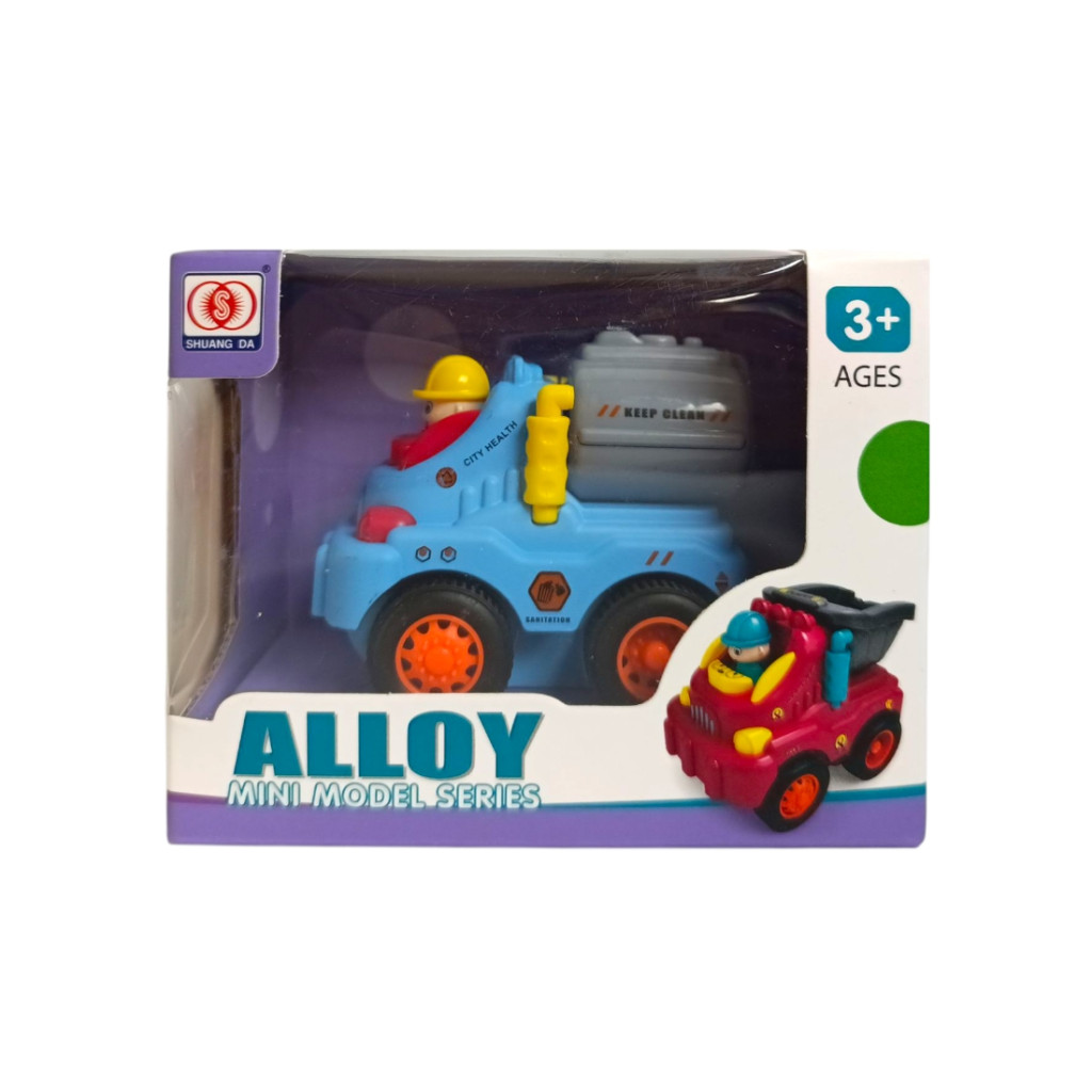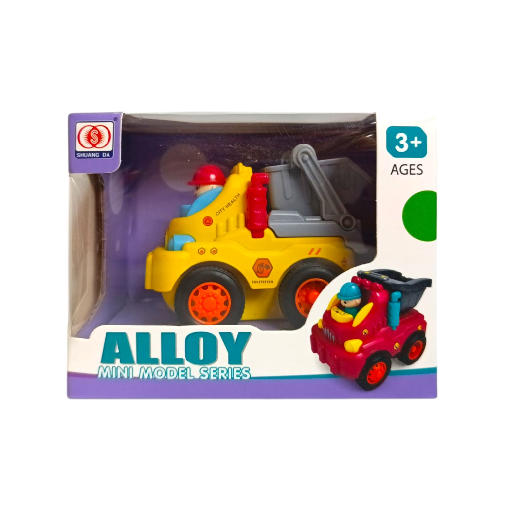 Fém és műa. bébi teherautó, munkagépes, lend., 3 féle, 12x10 cm dob.