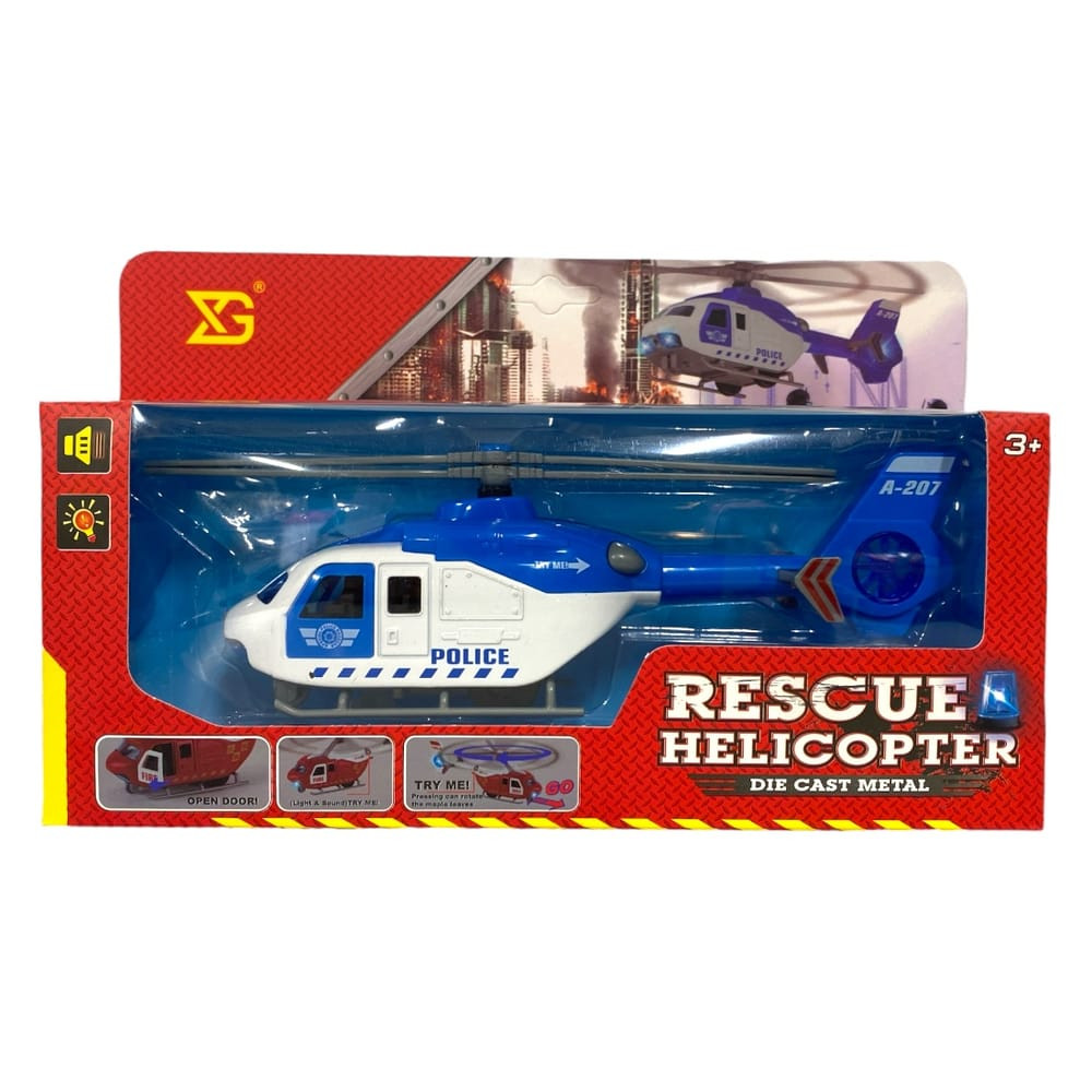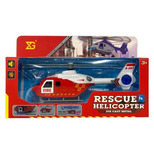Fém helikopter, el., igazi hang+fény, ajtónyit, forgó rotor, lend., 3 szín, 25x15 cm dob. Gombel.