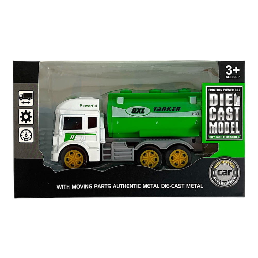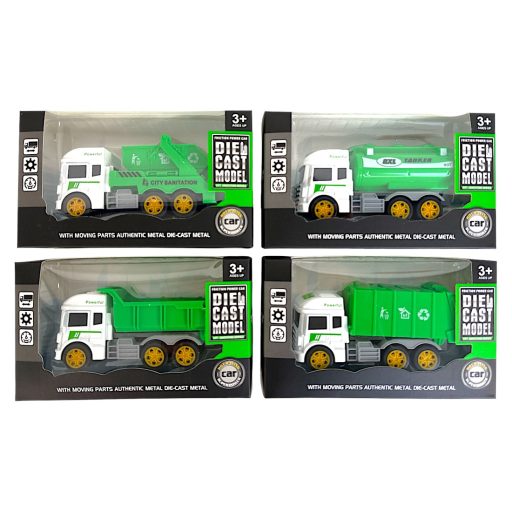 Fém teherautó, 4 féle, lend., kukás/tartályos, 12 cm, 18x11 cm dob.