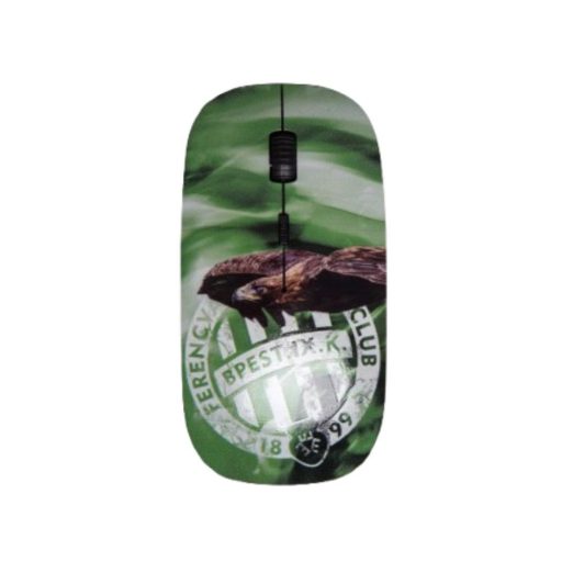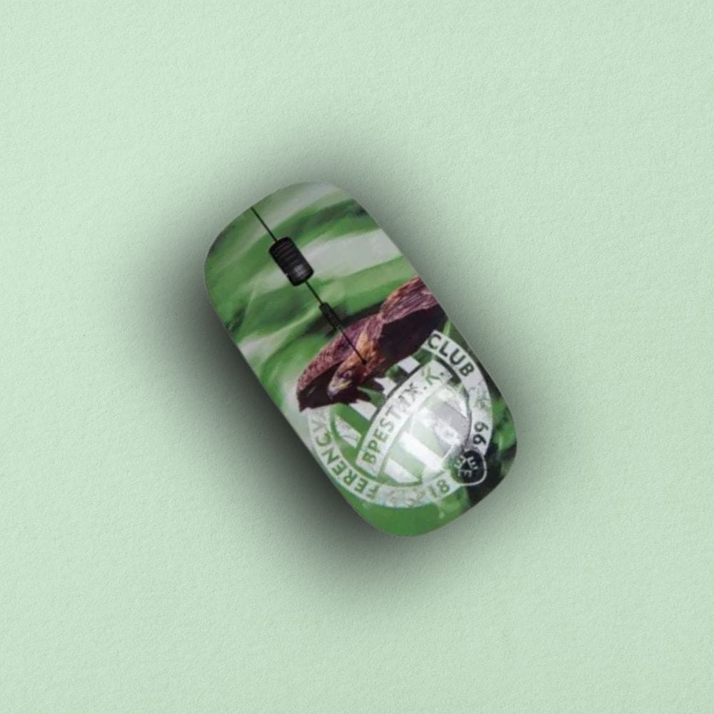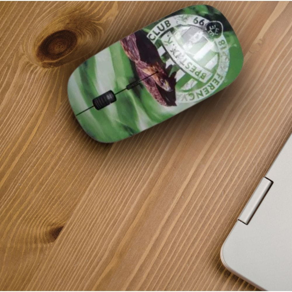 Zöld színű vezeték nélküli egér Fradi Sassal és a Ferencvárosi TC címerrel díszítve. Tökéletes választás munkához, tanuláshoz vagy otthoni használatra minden elkötelezett szurkoló számára.