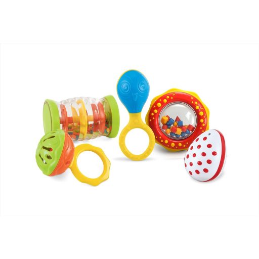 Íme egy teljes szett, amiből kedvükre választhatnak aktuális kedvenc játékot a gyerkőcök, de testvérek, friss barátok akár együtt is adhatnak koncertet. A Halilit Első bébi bandám csörgőkészlet egy kisebb csörgőjátékokból összeválogatott szett, amit az apró kezek is könnyen meg tudnak fogni és meg tudnak tartani. Némelyeknek fogantyúja van, de a csörgő tojás a nélkül is könnyen elfér a tenyérben. A kis csörgőhengert pedig nem csak a hangja teszi izgalmassá, de a szintjein ide-oda cikázó színes golyók, gyöngyök is.