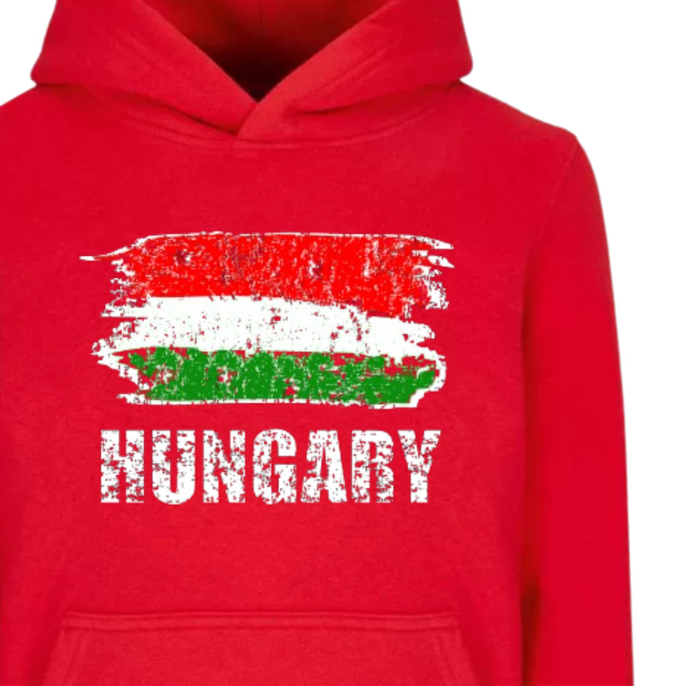 Elegáns és hazafias stílus! Ez a piros pamut pulóver a magyar zászló motívumával és alatta a „Hungary” felirattal készült. Tökéletes választás szurkolóknak vagy mindennapi viselethez.