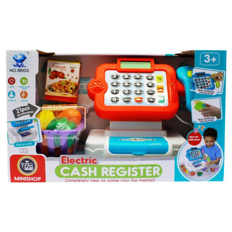 Pénztárgép klt., el., hang+fény, LCD kijelző, számológép, 2 szín, 33x20 cm dob.