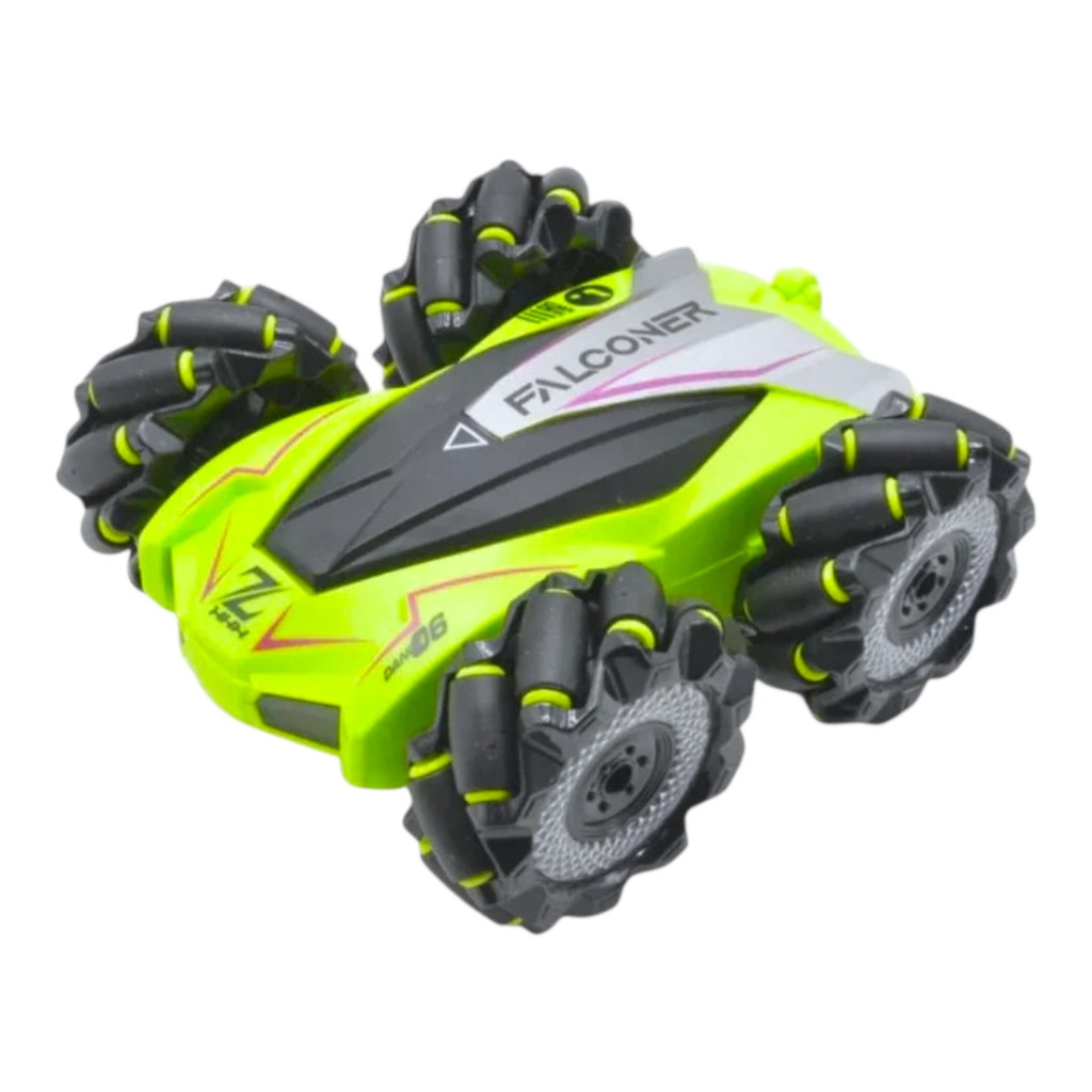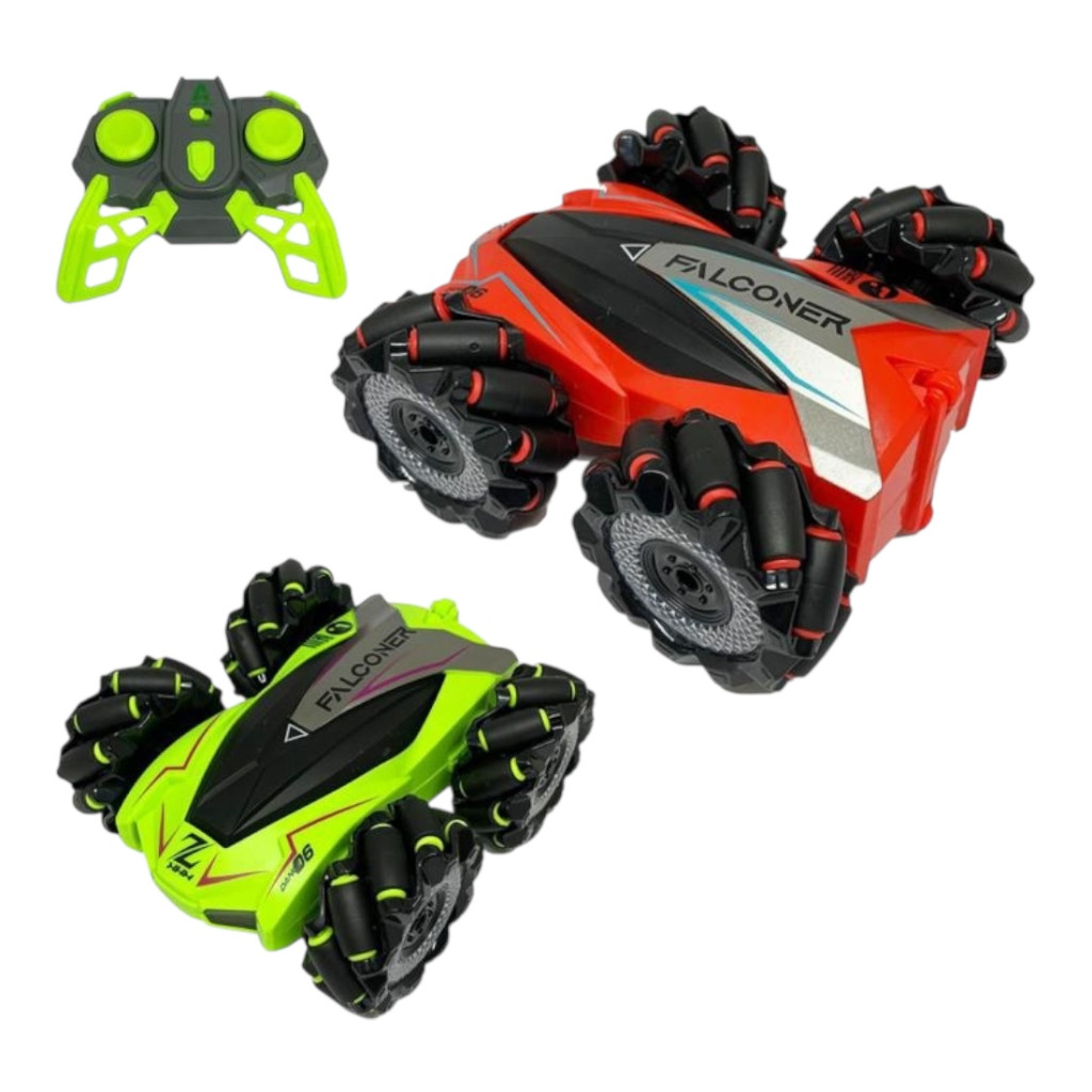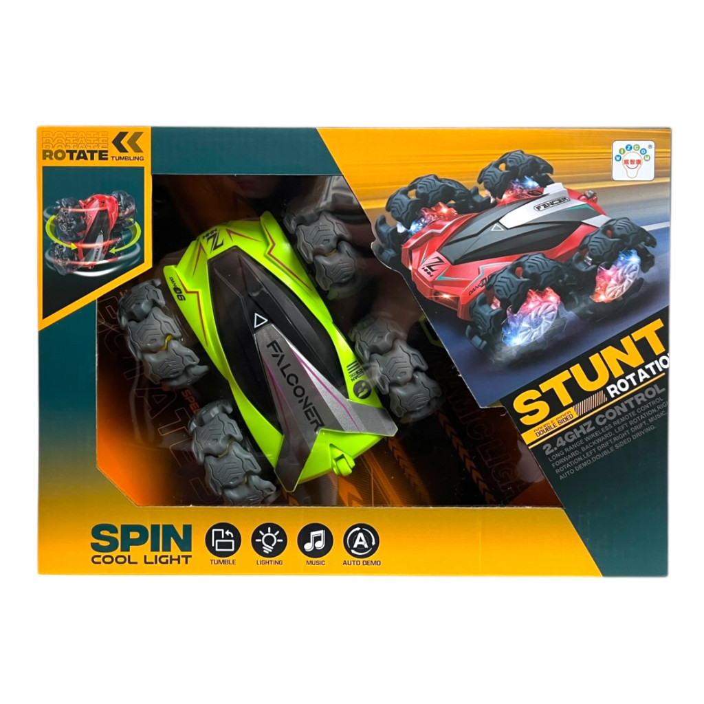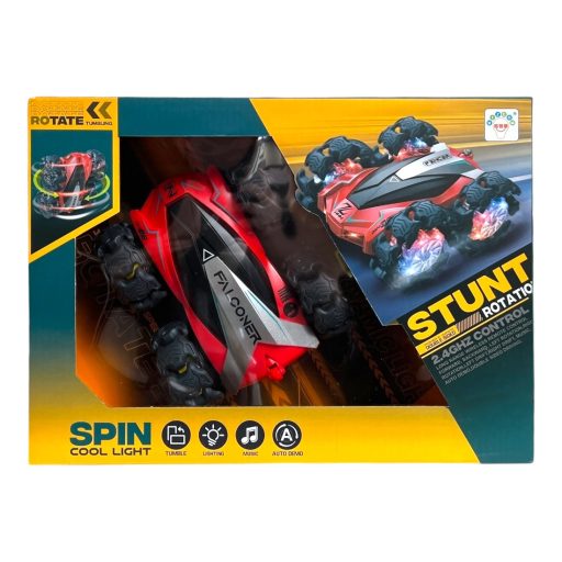 R/C autó, el., fullfunkc., driftel, szakaszos gumikerék vil., zenél, körbe forog, 2 szín, 32x23 cm dob.