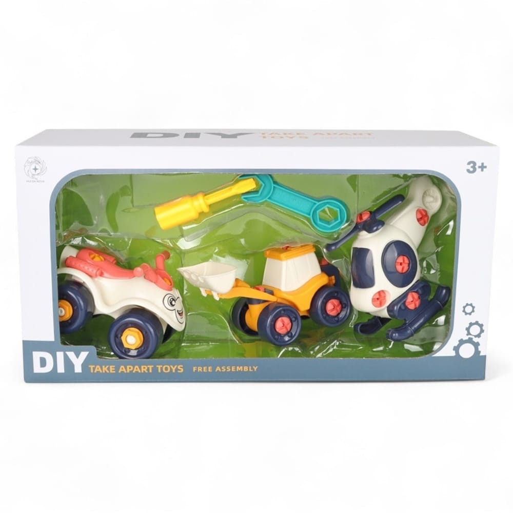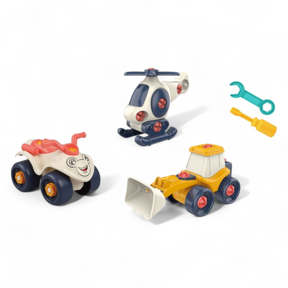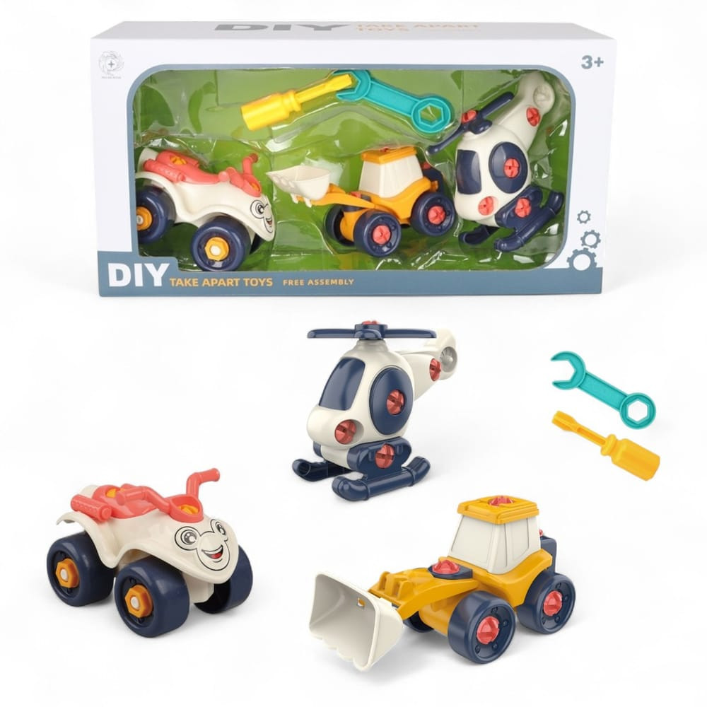 Szerelős jármű klt., 3 db, munkagép, helikopter, quad, 36x19 cm dob.