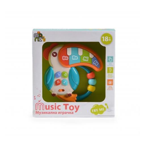 Vidám zenét játszó bébijáték, amely élénkíti a baba figyelmét. Elemmel működik.