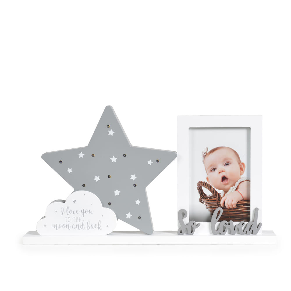 Ez a csillagos fotó váz több mint egy egyszerű képváz. Készült fából, ami természetes hangulatot kölcsönöz a kisgyermek szobájának, és integrált éjszakai fénye van, ami biztosítja a csendes és nyugodt alvást. Tökéletes dísztárgy bármelyik gyerekszobában, ahol az emlékeket szeretnénk megőrizni és a sötét éjszakákat valamivel barátságosabbá tenni. Különböző online boltokban kapható, amelyek babás és gyermek termékekre specializálódtak.