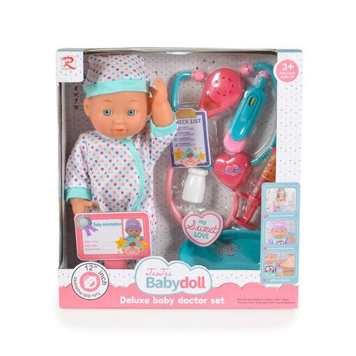 31 cm-es baba sztetoszkóppal és hanggal. A készlet tartalmaz orvosi kiegészítőket és egy orvosi jelvényt. A baba hangokat ad ki és 2 db AA 1,5V-os elemmel működik. A termék 3 évesnél idősebb gyermekek számára készült. Márka: Tutu love Csomagolási méret: 32x10,5x30 cm Súly kg: 0.5