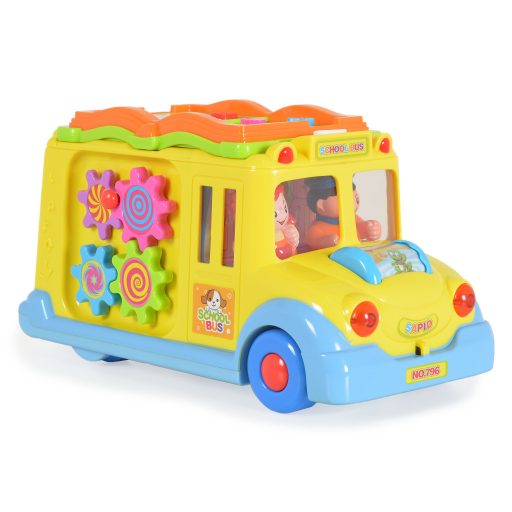 A busz szép kidolgozása és gazdag színei vonzzák a gyerekek figyelmét. A játék minden bizonnyal még a legigényesebb gyermeket is lenyűgözi. A busz magától mozog, és irányt vált, ha akadályba ütközik. Menet közben a fényszórói villognak, a vezető és az utas pedig zenére táncolnak. Az elején egy állatos görgő található, amely guruláskor világít, különböző dallamokat játszik, és nevető baba hangjait adja ki. A busz tetején egy kis könyv található. A könyv minden oldalán különböző színű és formájú gombok találhatók. Megnyomva az állatok hangjait hallhatjuk. Miután elfordítjuk a kulcsot, egy vicces hangot hallunk, az ajtó kinyílik, és mindig egy másik jelenetet mutat.