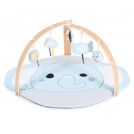 A termék 0 hónaposnál idősebb gyermekek számára készült. Az activity játszószőnyeg 2 játékpozícióval rendelkezik - háton és hason fekve. A készletben több játék is található - elefánt fülekkel, nyikorgó hangokkal és csörgővel, felhő csengővel és 3 puha játékkal. A játékok a játékrudakra rögzíthetők. A természetes fából készült játékrudak és az elefántos alátét úgy vannak kialakítva, hogy gyönyörűen kiegészítsék az otthoni színvilágot, és nyugodt környezetet teremtsenek a baba számára. Ez a termék segíti a gyermekek fejlődését, a kéz- és láb finom motorikát, a különböző formák és színek felismerését. A játék tornáztató szőnyeg nem mérgező anyagokból készült, biztonságos a gyermekek egészsége szempontjából. Anyaga: bükkfa és poliészter.