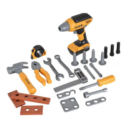 Valósághű készlet 28 alkatrésszel. A készlet tartalmaz egy fúrót 4 cserélhető fúrószárral, egy mérőszalagot, egy kalapácsot és sok más szerszámot. Egy praktikus hátizsák is található a szállításhoz.