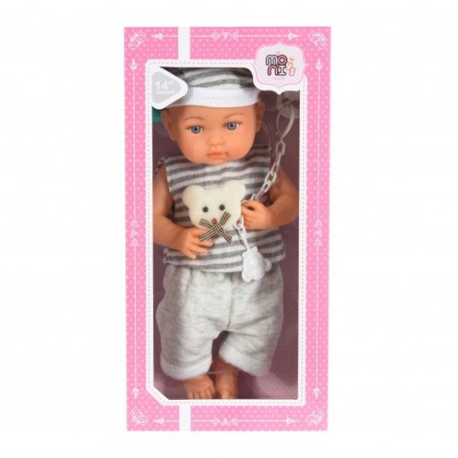 BABA 36 cmes FIÚ baba nadrágos, sapkás, CSÍKOS, macis felsőben. A babának haja nincs, öltöztethető, ölelhető kisbaba. 3 évesnél idősebb gyermekeknek ajánlott, szülői felügyelet mellett, az apró alkatrészekre ügyeljen, hogy a gyermekek szájába ne kerüljön. Ölelhető, játék közben a a gyermekek kreativitását és gondoskodását ösztönzi.