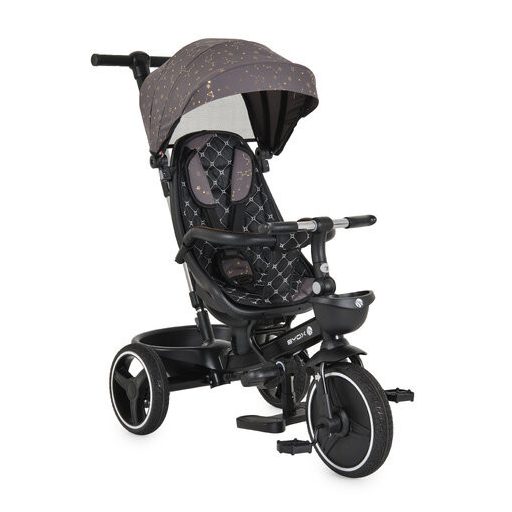 1-5 éves korú és legfeljebb 25 kg súlyú gyermekek számára. PU kerekek - elöl 12', hátul 10'. Első kerék szabadkerék funkcióval - az első kerék körbe mozoghat, de a pedálok rögzítettek, és a pedálok nem tudják irányítani a kereket. Állítható szülői tolókar, amely az első kerék mozgásának irányát szabályozza. Összecsukható kormány; 2 lábtartóval - egy a kisebb és egy a nagyobb gyermekek számára. Állítható tető; 360°-ban forgatható ülés; Háttámla - több fekvőhelyzetbe dönthető; Puha biztonsági sávval; levehető üléspárnával, 3 pontos biztonsági övekkel, 2 hátsó fékkel.