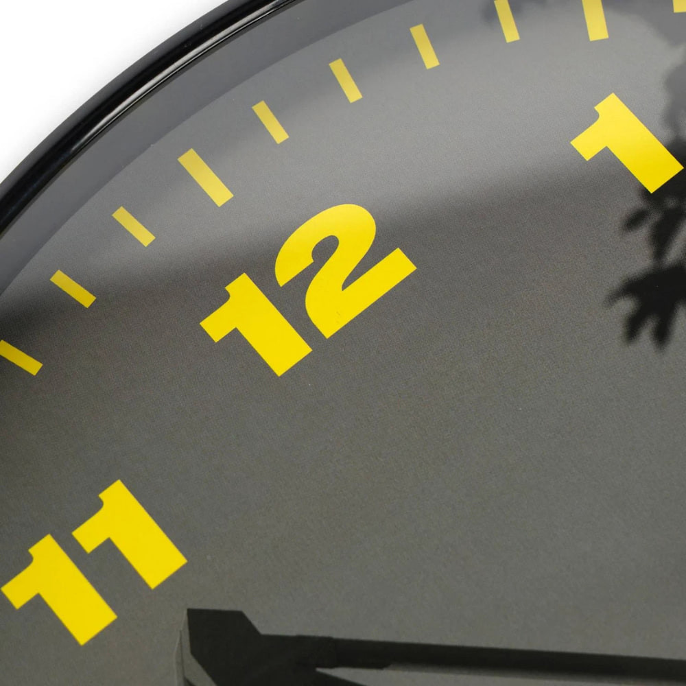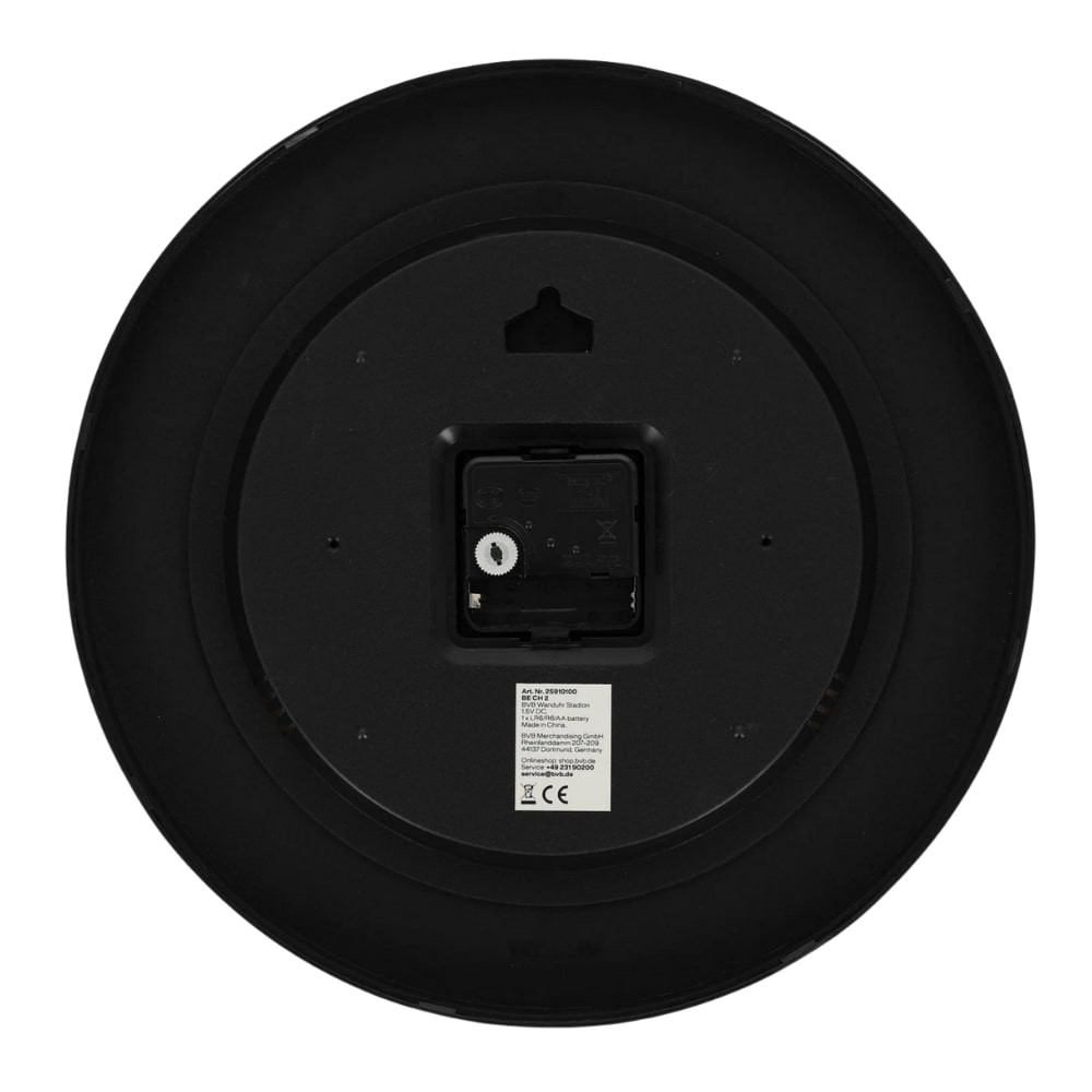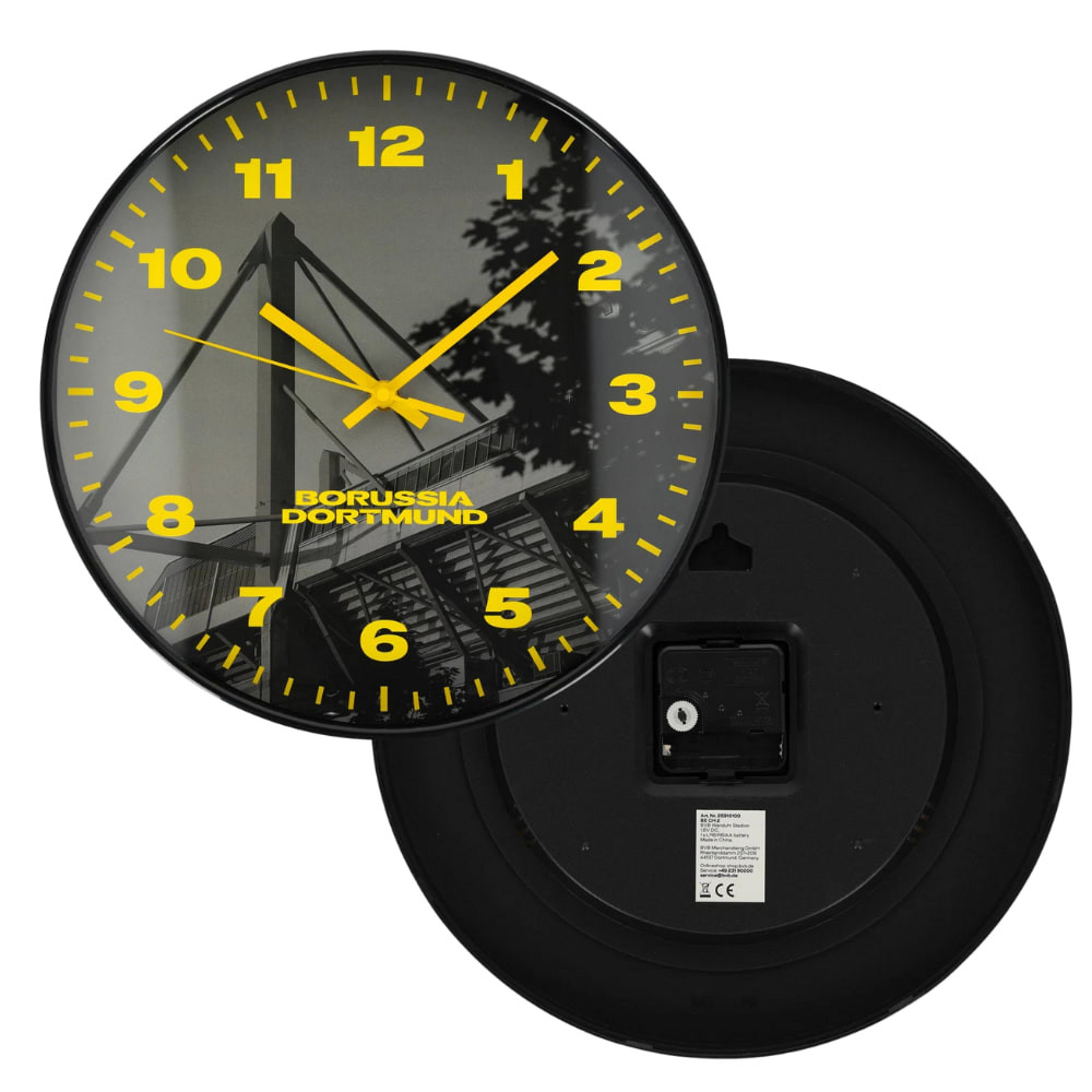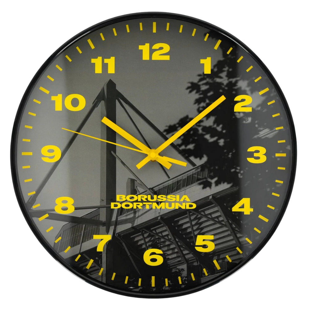 A BVB „Stadion” faliórával mindig szem előtt tarthatod a futball templomát – így pontosan tudod, mikor van a kezdőrúgás. Az órán egy látványos fekete-fehér kép látható a stadion egyik sarkáról, a jellegzetes pilonnal, míg a mutatók, az óraszámok és a Borussia Dortmund felirat élénk sárga színben jelennek meg.