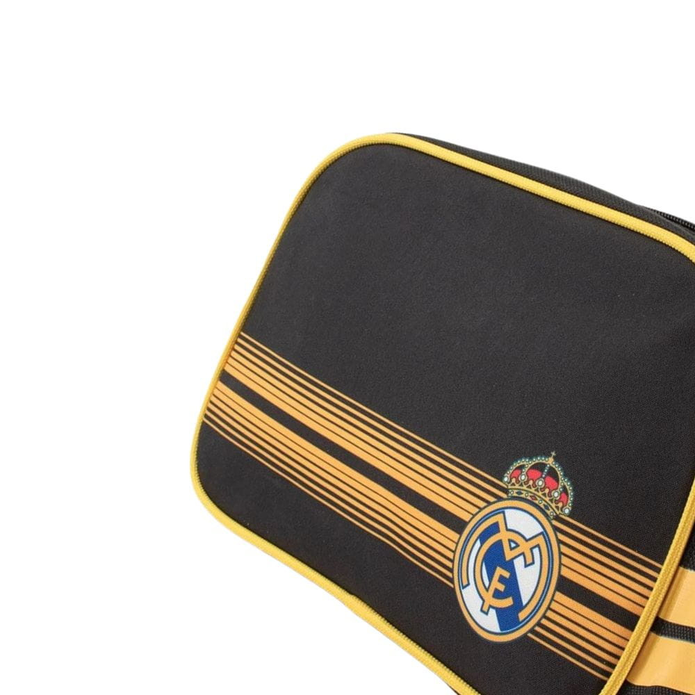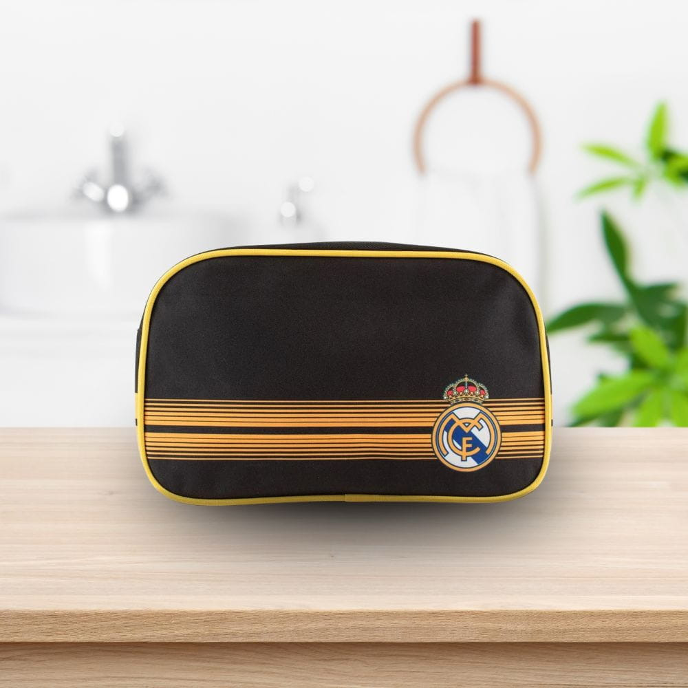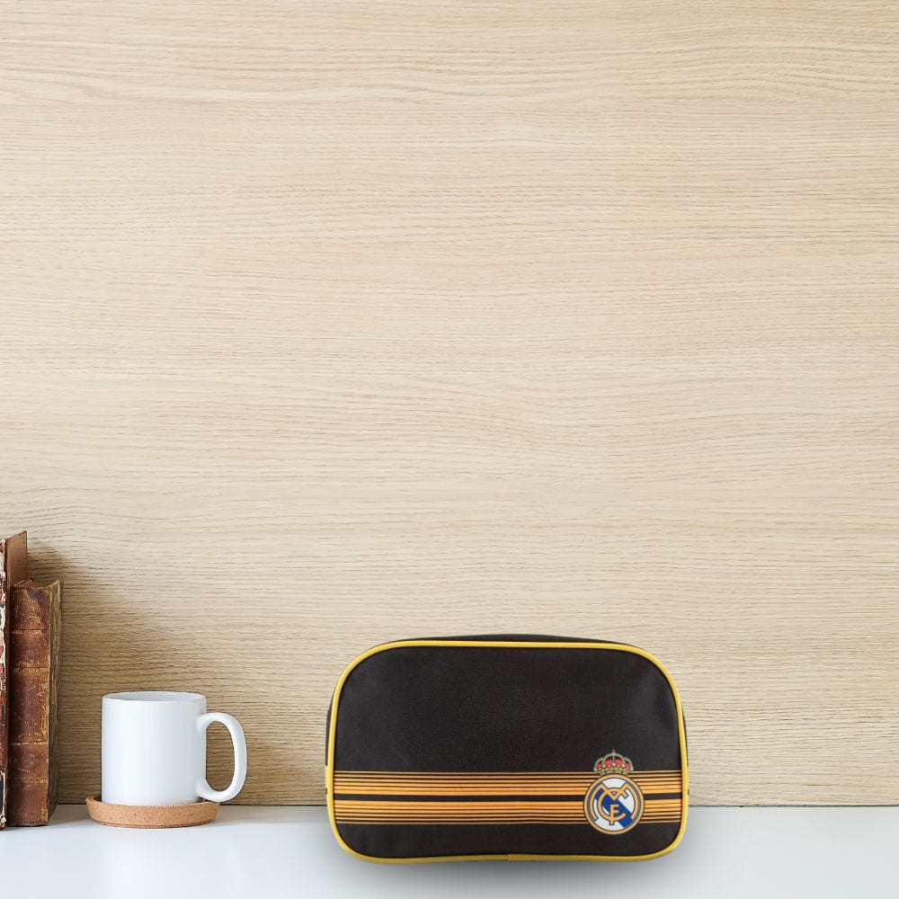 Ez az eredeti Real Madrid neszeszer stílusos és praktikus választás mindennapi használatra vagy utazáshoz. A sötétkék alapon futó sárga csíkos design és a klub címerével ellátott kialakítás tökéletes megjelenést biztosít minden szurkoló számára.