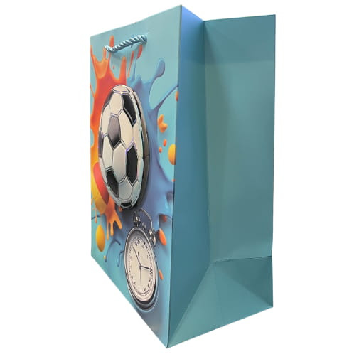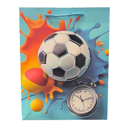 Emeld új szintre az ajándékozást ezzel a nagyméretű focis dísztasakkal! A kék alapon megjelenő 3D focilabda, stopperóra grafika és dinamikus, színes festékhatású mintázat igazán figyelemfelkeltő megjelenést biztosít.