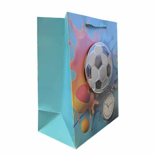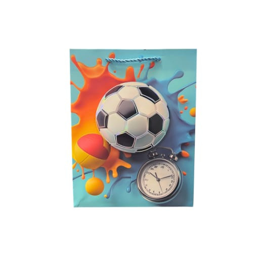 Tedd különlegessé az ajándékozást ezzel a látványos focis dísztasakkal! A kék alapszínű tasak 3D hatású focis grafikával készült, amelyet stopperóra motívum és dinamikus, színes festékhatású elemek tesznek igazán egyedivé.