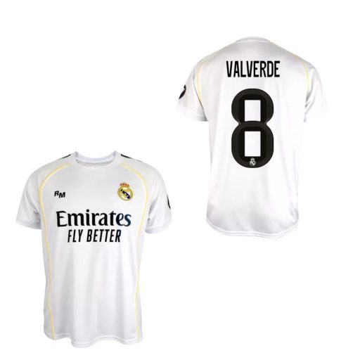 Viseld büszkén kedvenc játékosod, Valverde mezét, és mutasd meg, hogy igazi Real Madrid-szurkoló vagy! Ez az eredeti, 2025/26-os hazai szurkolói mez a klub ikonikus fehér stílusát idézi, nyomott címerrel és a hátán „Valverde 8” felirattal.