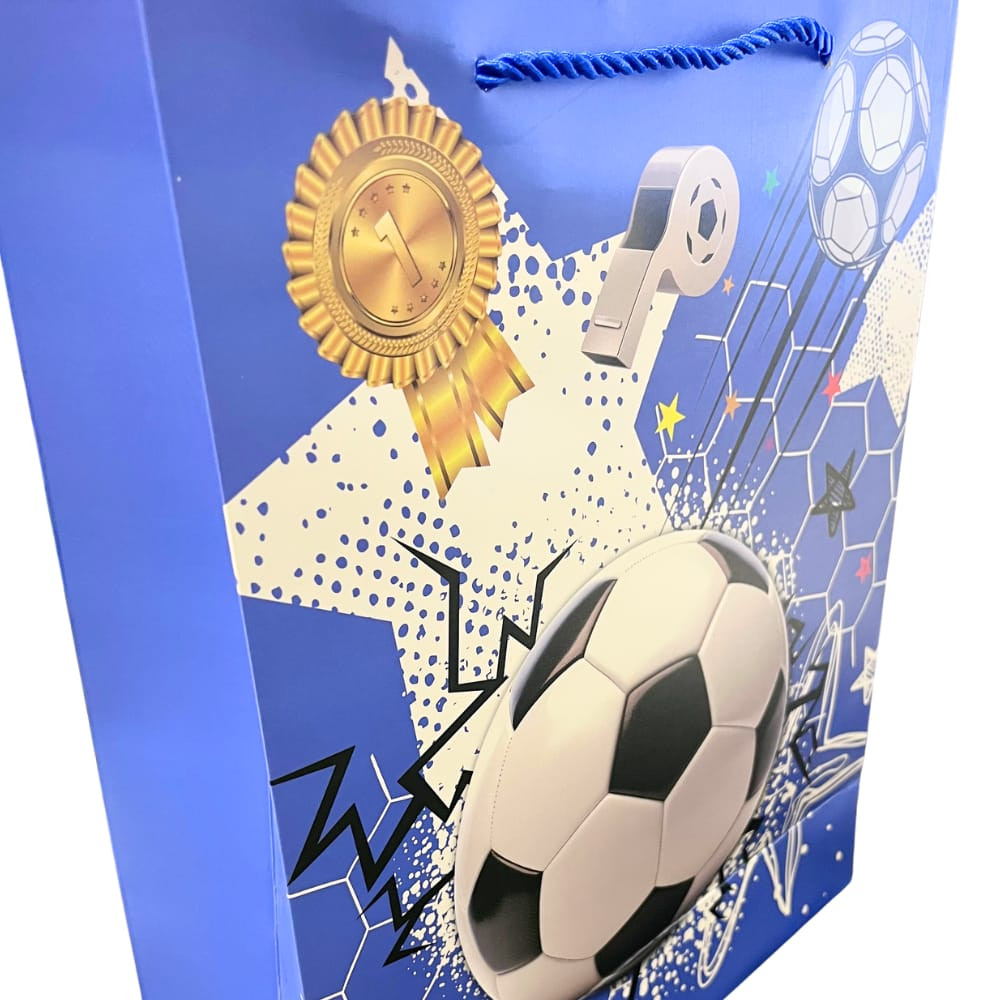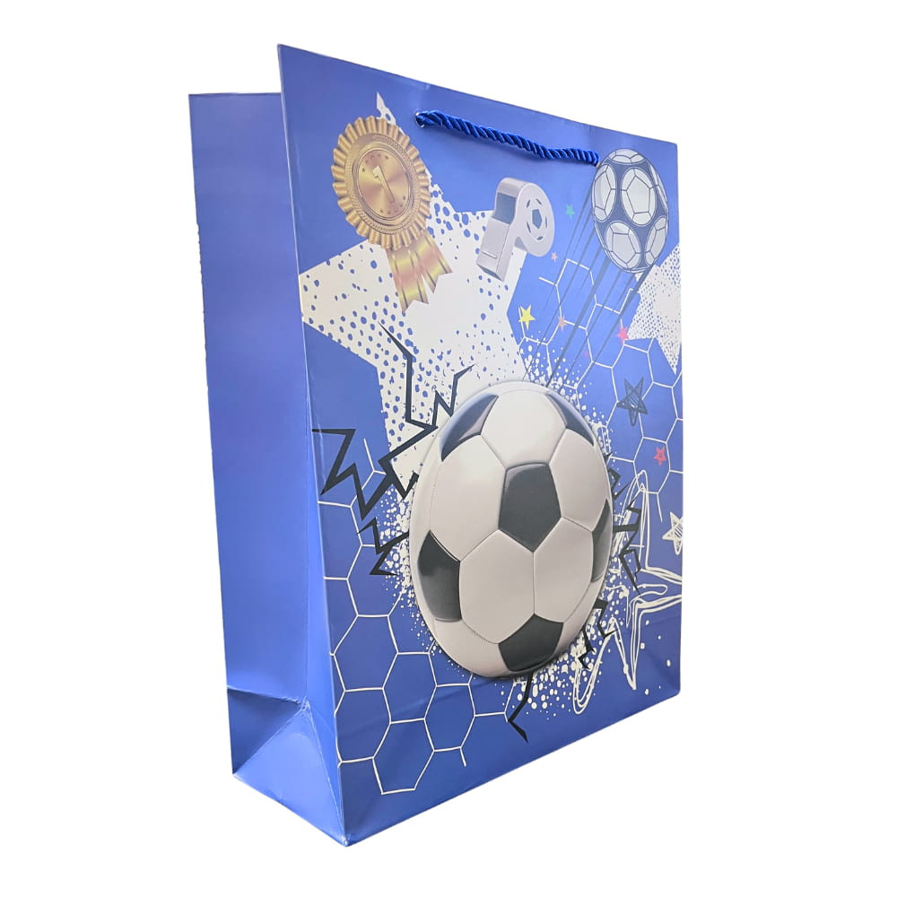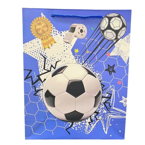 A mély kék alapszín és a csillagmintával kombinált focis dizájn modern, dinamikus hatást kelt, így nagyobb ajándékok esetén is stílusos csomagolást biztosít. A strapabíró kialakítás a praktikus használatot is garantálja.