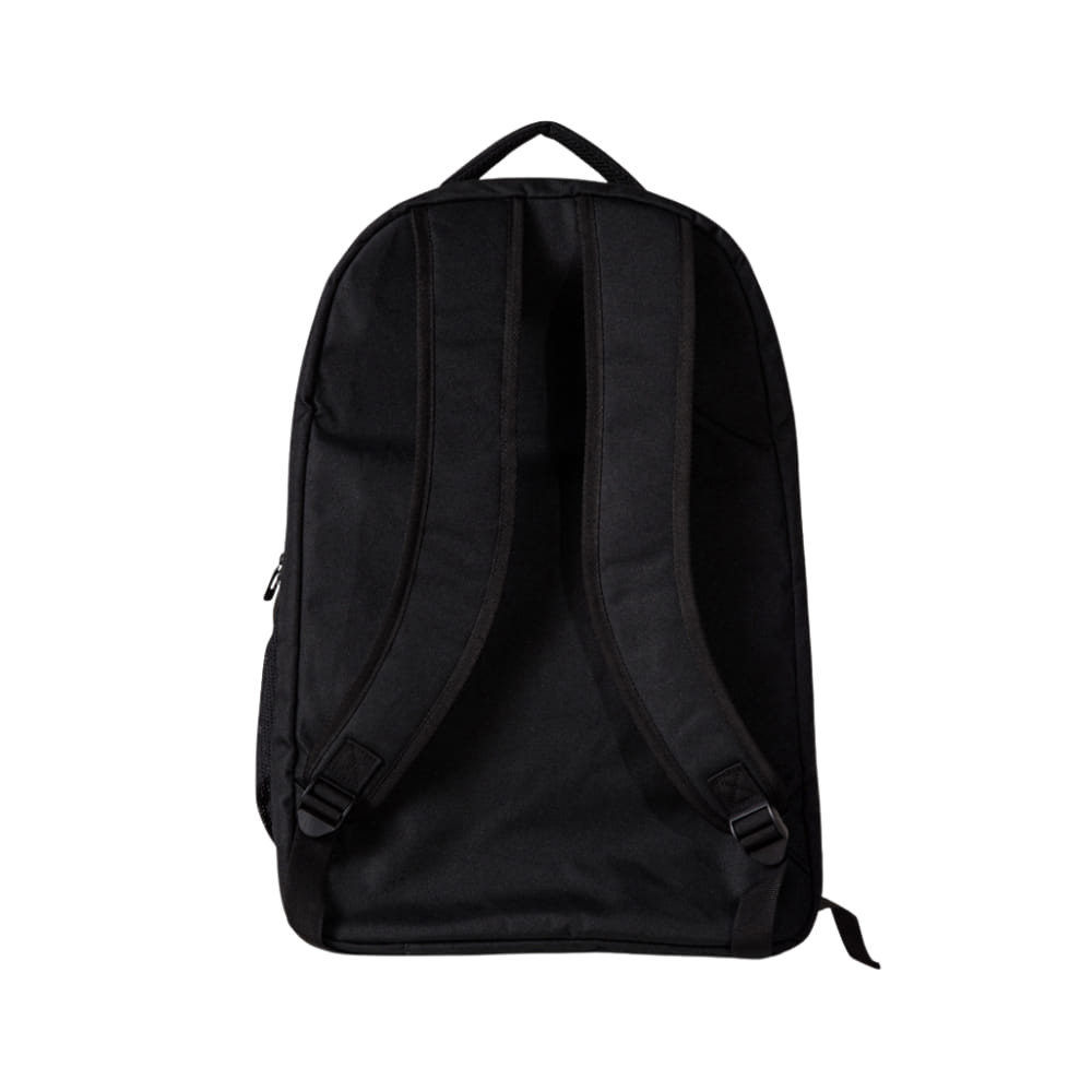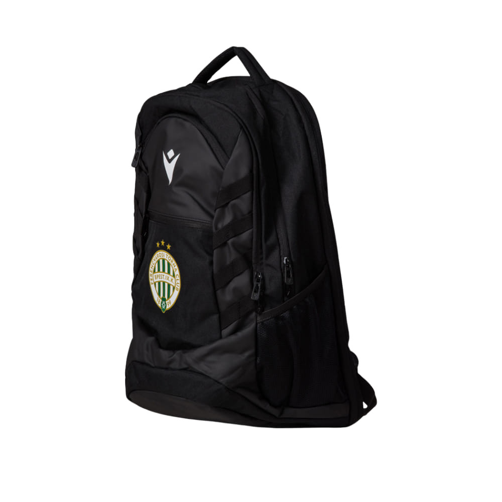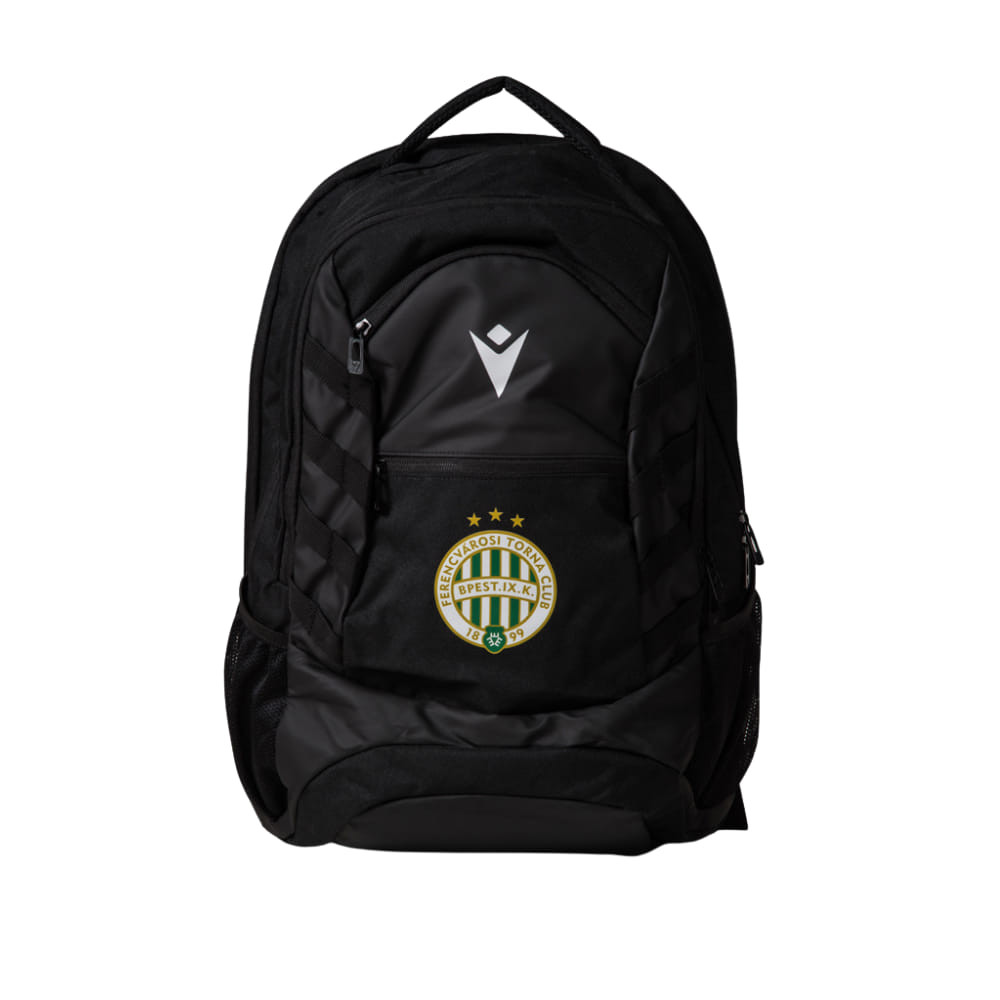 Vízálló fekete Macron hátizsák sötétszürke részekkel, az elején Macron logóval és FTC címerrel díszítve. Tágas fő rekesszel, 3 db kisebb elülső cipzáros zsebbel, valamint két oldalán hálós kulacstartóval rendelkezik. A kényelmes viselet érdekében párnázott vállpántokkal és hátpanellel lett kialakítva. Anyag: poliészter. Mérete: 37x56x28 cm.