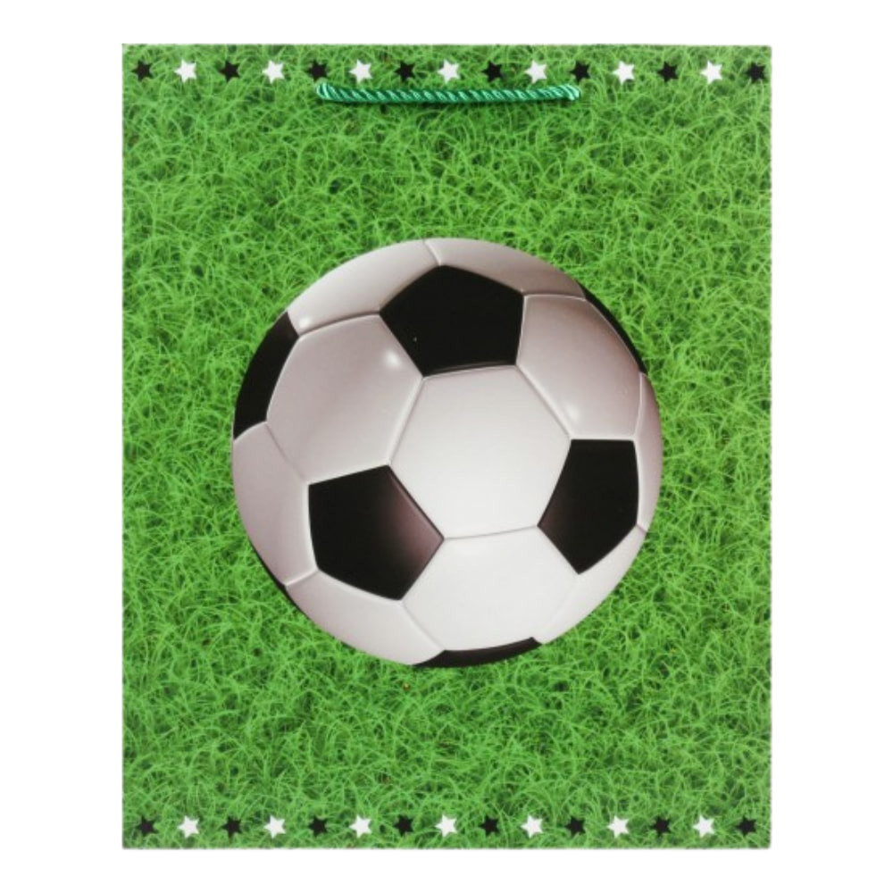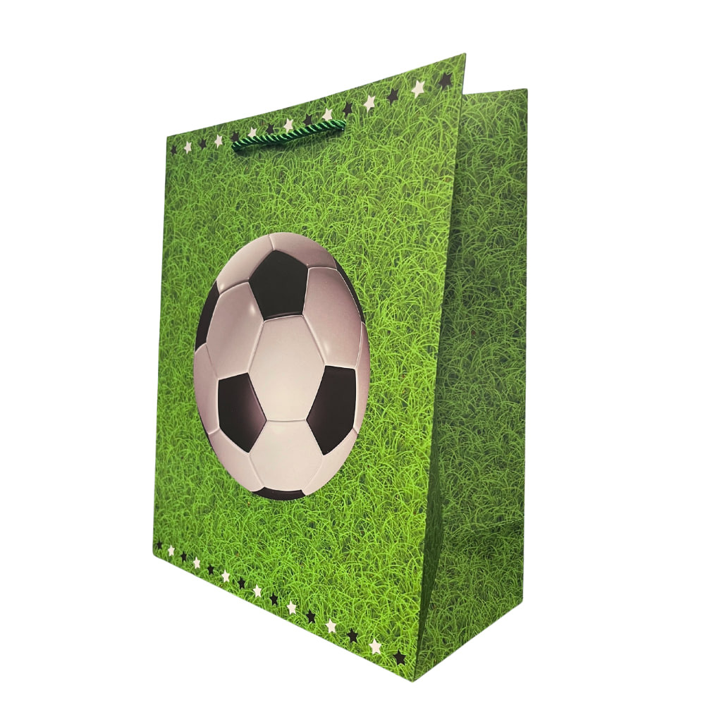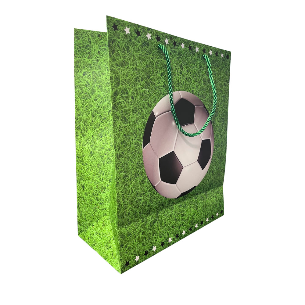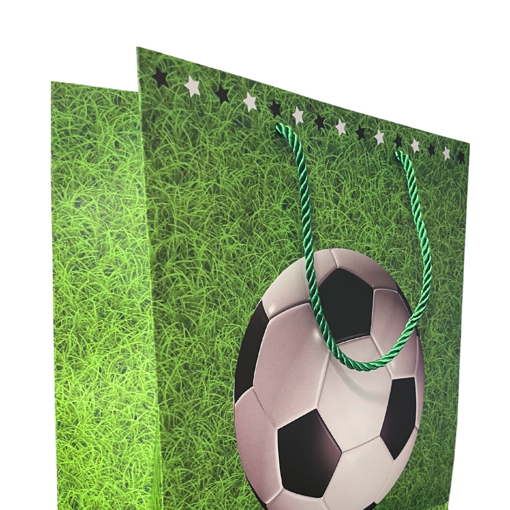 Eredeti focilabdás dísztasak, amely tökéletes választás ajándékok csomagolásához minden focirajongó számára. A zöld füves háttér és a klasszikus fekete-fehér labda mintája igazi sportos hangulatot teremt.