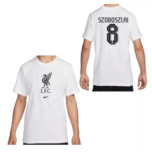 Dobd fel a szurkolást ezzel a vagány Liverpool FC gyerek pólóval! A fehér szín, az eredeti Liverpool FC felirat és a Nike logó mind a hűségedet tükrözi az egyik legnagyobb angol klub iránt. A póló hátulján a Szoboszlai 8 szám látható, így mindenki tudni fogja, hogy ki a kedvenc játékosod. A 100% pamut anyaga garantálja a kényelmet és a tartósságot, így a póló tökéletes választás mind a meccsnapokra, mind a mindennapi viseletre. Ez az eredeti licenszes termék egyenesen Angliából érkezett, biztosítva a minőséget és az autentikusságot. Ne csak nézd a játékot, légy része annak a Liverpool FC gyerek pólóval!