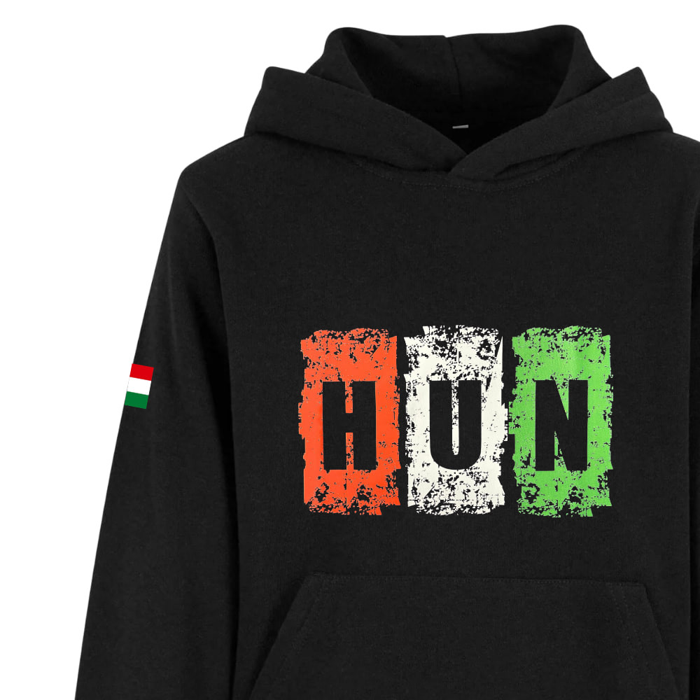 Stílusos és kényelmes viselet a magyar színekben! Ez a fekete, kapucnis pamut pulóver a nemzeti színek – piros, fehér és zöld – valamint a „HUN” felirat kombinációjával készült, így minden helyzetben büszkén viselheted a hazaszeretet jelképeként.