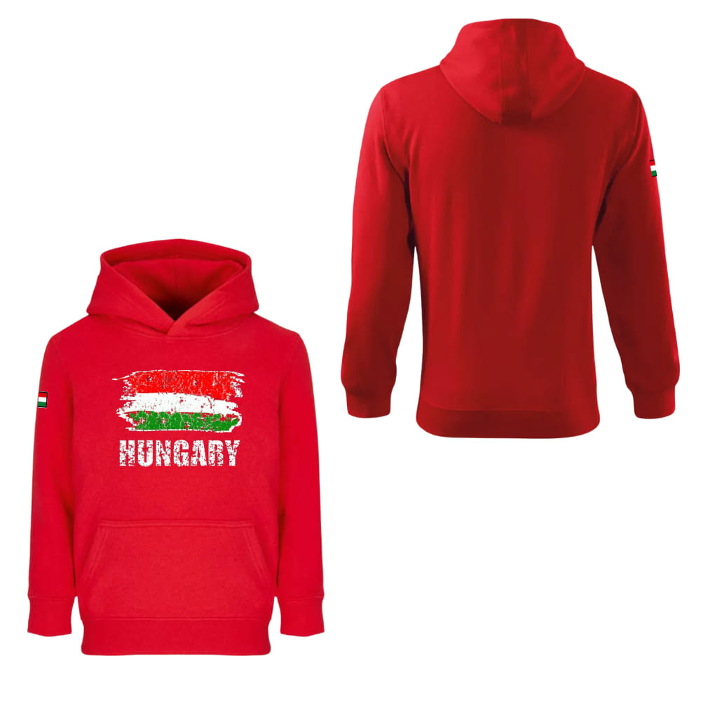 Elegáns és hazafias stílus! Ez a piros pamut pulóver a magyar zászló motívumával és alatta a „Hungary” felirattal készült. Tökéletes választás szurkolóknak vagy mindennapi viselethez.