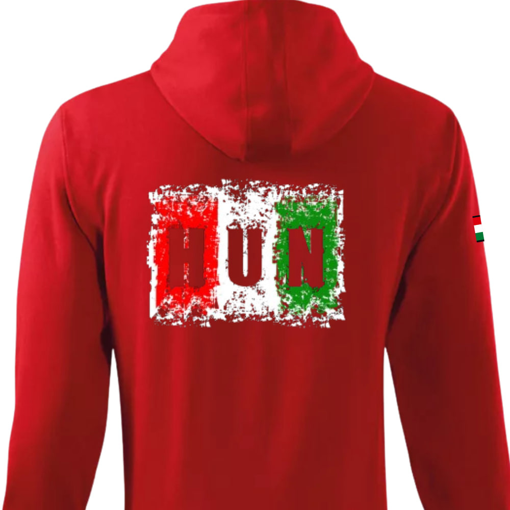 Magyar pamut kapucnis cipzáras pulóver – piros, „HUN” felirattal