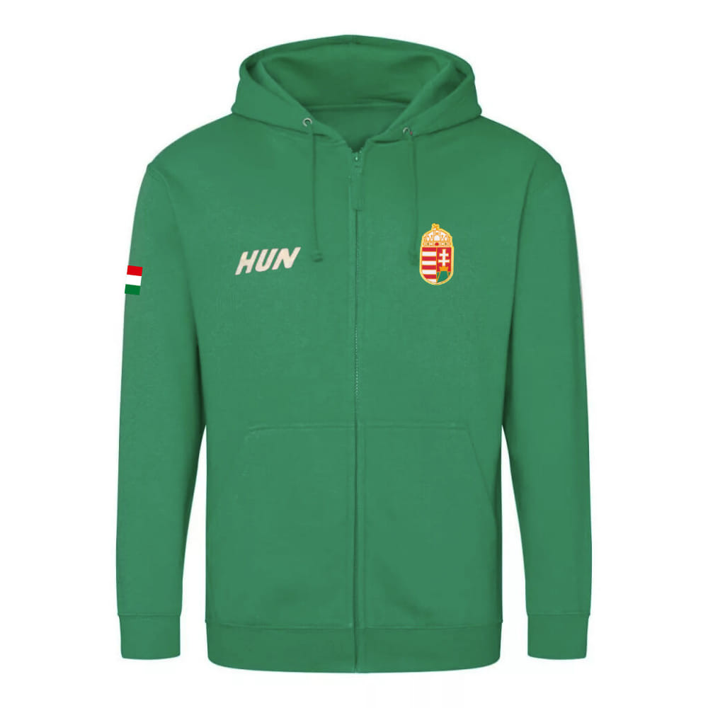 Sportos és kényelmes viselet a nemzeti színekben! Ez a zöld, cipzáras pamut pulóver a piros-fehér-zöld színekből kialakított „HUN” felirattal készült, így tökéletes választás szurkoláshoz, sporthoz vagy hétköznapi öltözethez.