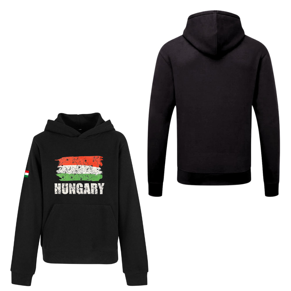 Egyszerű, mégis erőteljes megjelenés a magyar színekben! Ez a fekete, kapucnis pamut pulóver a magyar zászló motívumával és alatta a „Hungary” felirattal készült, így visszafogott, de látványos módon fejezheted ki nemzeti büszkeséged.