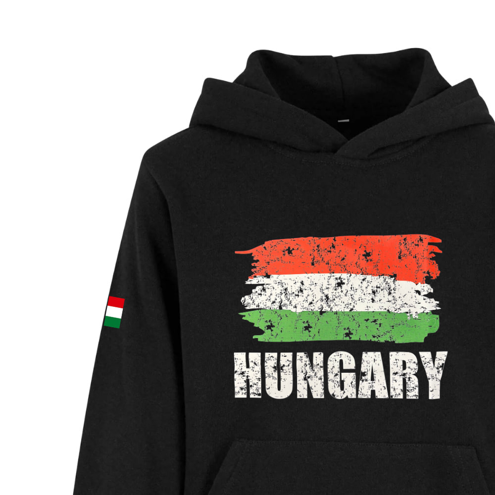 Egyszerű, mégis erőteljes megjelenés a magyar színekben! Ez a fekete, kapucnis pamut pulóver a magyar zászló motívumával és alatta a „Hungary” felirattal készült, így visszafogott, de látványos módon fejezheted ki nemzeti büszkeséged.