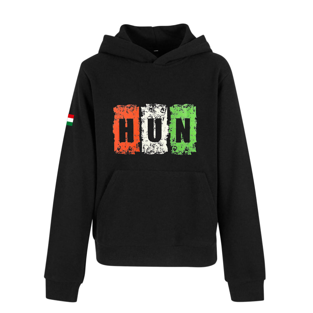 Stílusos és kényelmes viselet a magyar színekben! Ez a fekete, kapucnis pamut pulóver a nemzeti színek – piros, fehér és zöld – valamint a „HUN” felirat kombinációjával készült, így minden helyzetben büszkén viselheted a hazaszeretet jelképeként.
