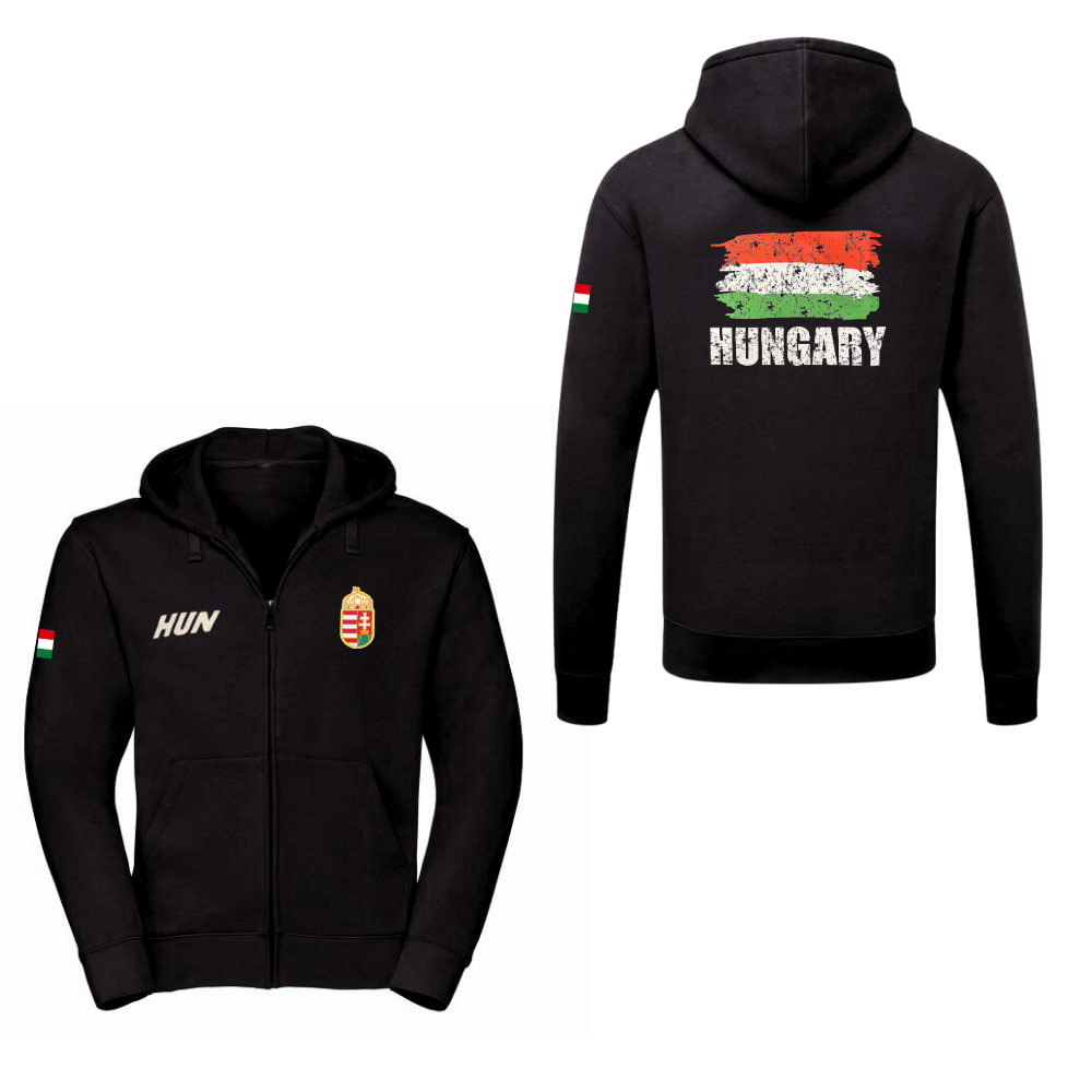 Visszafogott, de elegáns nemzeti stílus! Ez a fekete, cipzáras pamut pulóver a magyar zászló motívumával és alatta a „Hungary” felirattal díszített, így egyszerre sportos és stílusos.