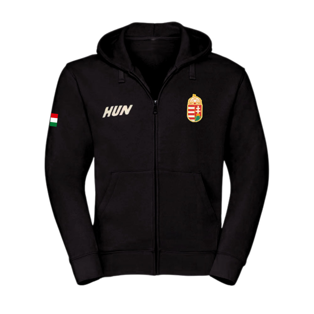 Magyar pamut kapucnis cipzáras pulóver – fekete, „HUN” felirattal