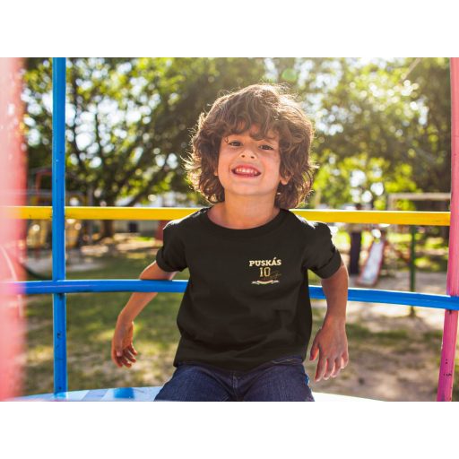 Egy igazi futballrajongó számára nincs is jobb, mint büszkén viselni a legendás Puskás Ferenc emlékére készült fekete pólót. Ez a gyerek méretű, PUSKÁS10 jelzéssel ellátott póló a Puskás kollekció egyik legnépszerűbb darabja. Az aranyszínű 10-es szám a legújabb divattrendeknek megfelelően került rá, miközben mégis a múltat idézi, ezáltal igazán retró hangulatot áraszt. A Puskás rajongók szerte a világon valóságos ereklyeként kezelik ezt a minőségi pamutból készült pólót. A hagyományos méretezésű kategóriák mindegyikében megrendelhető, így minden gyermek számára tökéletes választás lehet. Ráadásul a PUSKÁS10 pólók az egyedüli, a család által hivatalosan engedélyezett Puskás-pólók közé tartoznak, ami még különlegesebbé teszi őket.