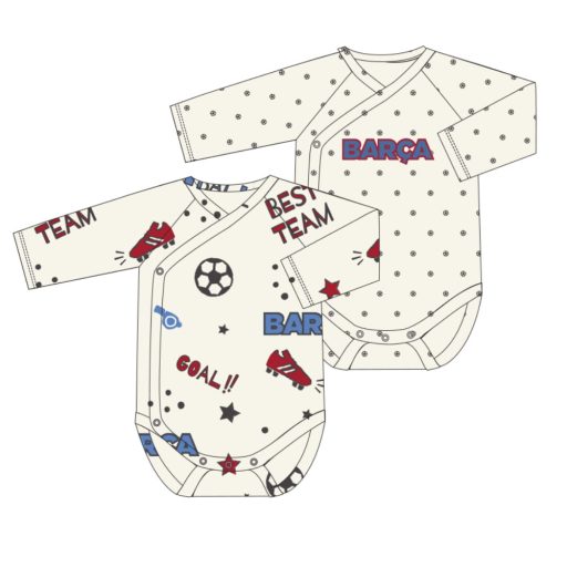 "Barcelona baby body hosszú ujjú 2 db" - Öltöztesd fel a legkisebb Barcelona szurkolódat is a kedvenc csapatod színeibe! Ez a csomag két hosszú ujjú bababodyt tartalmaz, mindegyik a híres Barcelona logóval. A 100% pamut anyag garantálja a kényelmet és az egészségességet, míg a nikkelmentes patentok biztosítják, hogy a body nem irritálja a baba érzékeny bőrét. Az egyik body krémszínű, rajta a "BARCA" felirattal és futballmotívumokkal, míg a másik apró focilabdákkal díszített és a "BARCA" felirattal ellátott. Mindkettő eredeti licencelt termék, közvetlenül Spanyolországból. Tedd boldoggá a legkisebb szurkolót is, hiszen sosem lehet elég korán kezdeni a drukkolást!