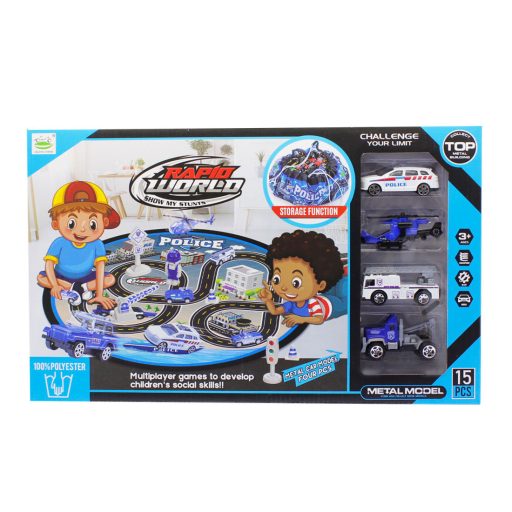 Játszószőnyeg , 2 az 1ben, 4 darab rendőrautóval , 2 féle változatban, a szőnyeg játéktárolásra alkalmazható zsákká alakítható, 41x25 cm dobozban.